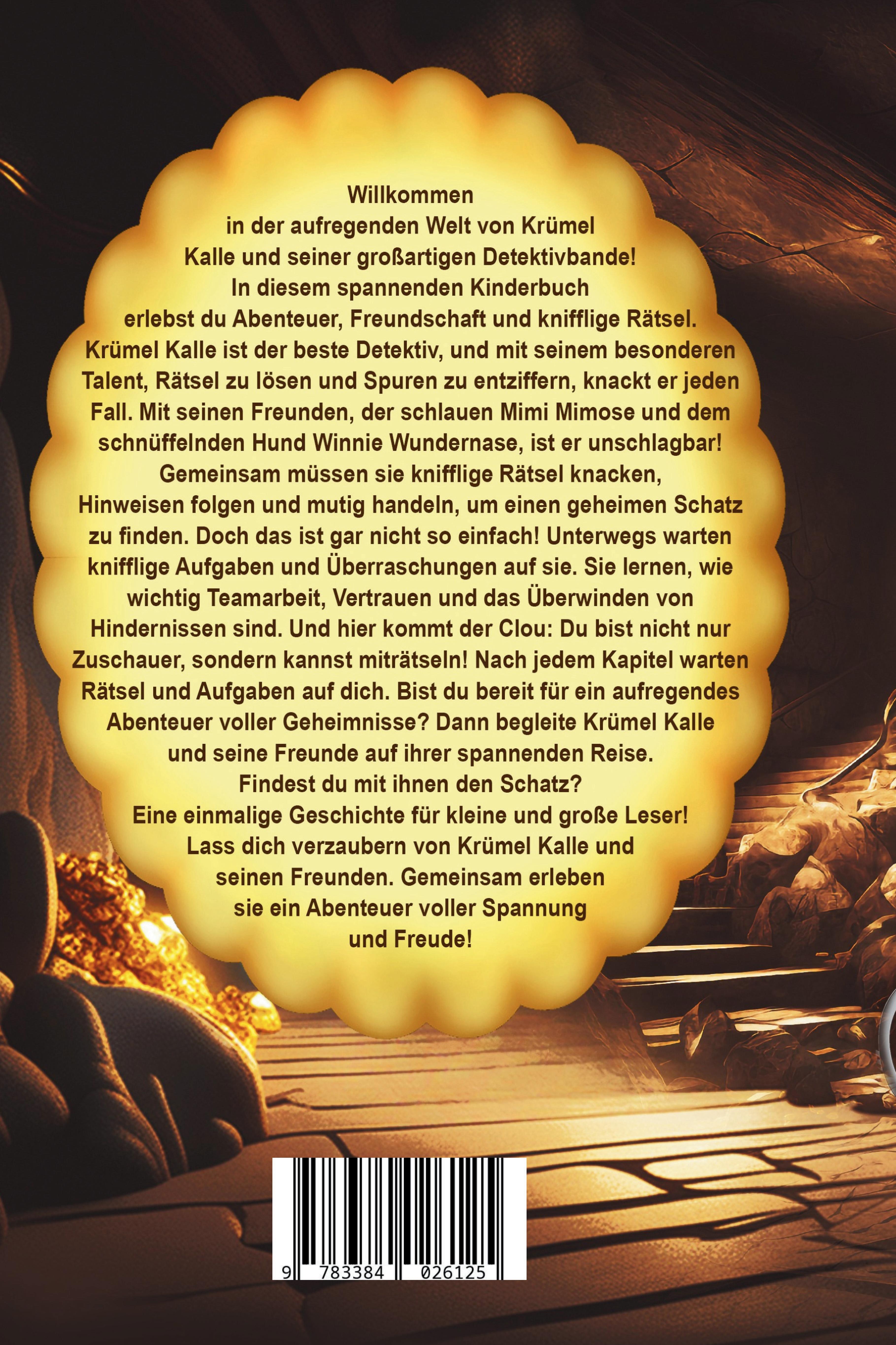 Tauchen Sie ein in "Ein Fall für Krümel Kalle und die Keksbande - Die geheimnisvolle Schatzsuche", ein Kinderbuch, das Abenteuerlust, Rätselspaß und wertvolle Lebenslektionen vereint. Begleiten Sie Krümel Kalle, den meisterhaften jungen Detektiv, und seine treuen Freunde, die kluge Katze Mimi Mimose und den erfinderischen Hund Winnie Wundernase, auf einer spannenden Schatzjagd, die Ihre Kinder fesseln wird.Warum dieses Buch ein Highlight für Ihr Kind ist:Spannende Abenteuer: Jedes Kapitel steckt voller aufregender Wendungen und führt die junge Detektivbande auf die Spur eines mysteriösen Schatzes.Interaktive Rätsel: Nach jedem Kapitel warten herausfordernde Rätsel und Denkaufgaben, die zum Mitmachen einladen und junge Köpfe spielerisch fördern.Charakterstarke Freunde: Die liebenswerten und vielschichtigen Charaktere inspirieren mit ihrer Klugheit, ihrem Mut und ihrer Loyalität.Warum Eltern dieses Buch schätzen:Fördert Lese- und Denkfähigkeiten: Neben dem Lesespaß regen die eingebundenen Rätsel zum logischen Denken an und unterstützen die Entwicklung kognitiver Fähigkeiten.Vermittelt positive Werte: Teamgeist, Freundschaft und der Glaube an sich selbst werden großgeschrieben und kindgerecht vermittelt.Qualitätszeit für die Familie: Dieses Buch bietet die perfekte Gelegenheit für gemeinsame Leseabende, die die Bindung stärken und gemeinsame Erinnerungen schaffen.Machen Sie "Ein Fall für Krümel Kalle und die Keksbande - Die geheimnisvolle Schatzsuche" zum neuen Lieblingsbuch Ihres Kindes. Es ist der ideale Begleiter für kleine Entdecker und Rätselfreunde, die bereit sind, sich in ein Abenteuer voller Spannung, Freundschaft und Spaß zu stürzen.Sichern Sie sich jetzt Ihr Exemplar und lassen Sie Ihre Kinder Teil der aufregenden Welt von Krümel Kalle und seiner Detektivbande werden. Ein unvergessliches Leseabenteuer wartet auf sie!