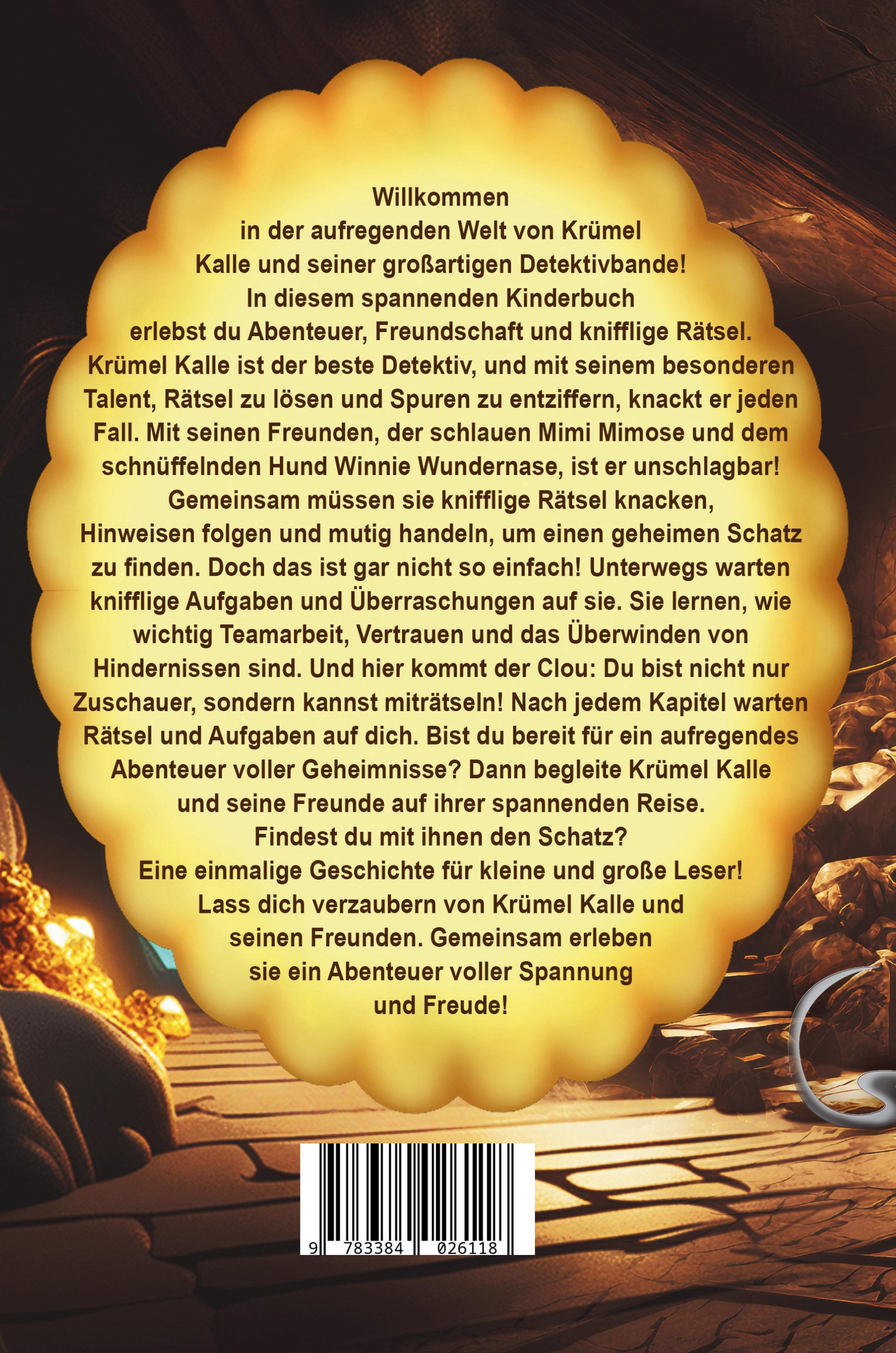 Tauchen Sie ein in "Ein Fall für Krümel Kalle und die Keksbande - Die geheimnisvolle Schatzsuche", ein Kinderbuch, das Abenteuerlust, Rätselspaß und wertvolle Lebenslektionen vereint. Begleiten Sie Krümel Kalle, den meisterhaften jungen Detektiv, und seine treuen Freunde, die kluge Katze Mimi Mimose und den erfinderischen Hund Winnie Wundernase, auf einer spannenden Schatzjagd, die Ihre Kinder fesseln wird.Warum dieses Buch ein Highlight für Ihr Kind ist:Spannende Abenteuer: Jedes Kapitel steckt voller aufregender Wendungen und führt die junge Detektivbande auf die Spur eines mysteriösen Schatzes.Interaktive Rätsel: Nach jedem Kapitel warten herausfordernde Rätsel und Denkaufgaben, die zum Mitmachen einladen und junge Köpfe spielerisch fördern.Charakterstarke Freunde: Die liebenswerten und vielschichtigen Charaktere inspirieren mit ihrer Klugheit, ihrem Mut und ihrer Loyalität.Warum Eltern dieses Buch schätzen:Fördert Lese- und Denkfähigkeiten: Neben dem Lesespaß regen die eingebundenen Rätsel zum logischen Denken an und unterstützen die Entwicklung kognitiver Fähigkeiten.Vermittelt positive Werte: Teamgeist, Freundschaft und der Glaube an sich selbst werden großgeschrieben und kindgerecht vermittelt.Qualitätszeit für die Familie: Dieses Buch bietet die perfekte Gelegenheit für gemeinsame Leseabende, die die Bindung stärken und gemeinsame Erinnerungen schaffen.Machen Sie "Ein Fall für Krümel Kalle und die Keksbande - Die geheimnisvolle Schatzsuche" zum neuen Lieblingsbuch Ihres Kindes. Es ist der ideale Begleiter für kleine Entdecker und Rätselfreunde, die bereit sind, sich in ein Abenteuer voller Spannung, Freundschaft und Spaß zu stürzen.Sichern Sie sich jetzt Ihr Exemplar und lassen Sie Ihre Kinder Teil der aufregenden Welt von Krümel Kalle und seiner Detektivbande werden. Ein unvergessliches Leseabenteuer wartet auf sie!