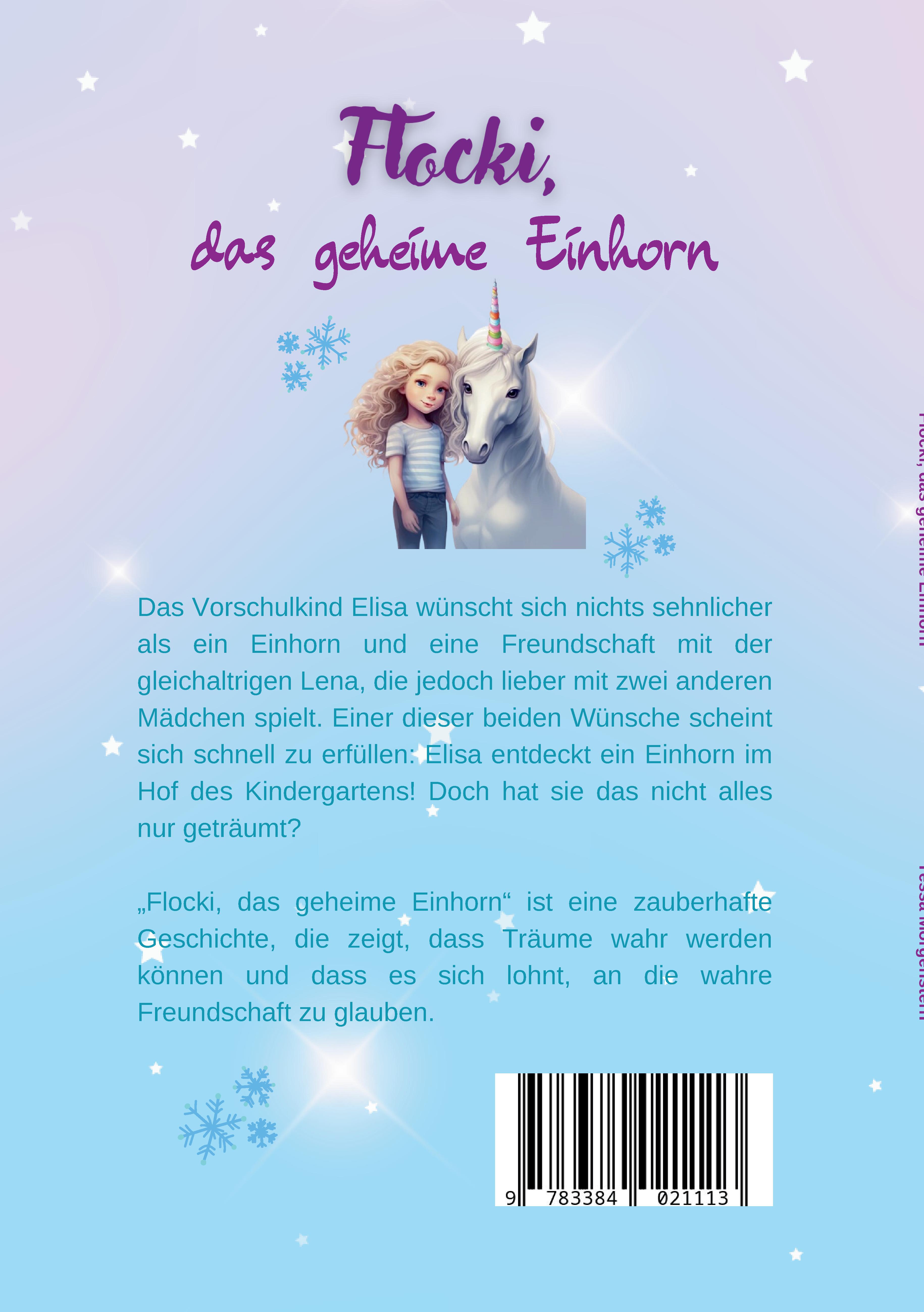 Das Vorschulkind Elisa wünscht sich nichts sehnlicher als ein Einhorn und eine Freundschaft mit der gleichaltrigen Lena, die jedoch lieber mit zwei anderen Mädchen spielt. Einer dieser beiden Wünsche scheint sich schnell zu erfüllen: Elisa entdeckt ein Einhorn im Hof des Kindergartens! Doch hat sie das nicht alles nur geträumt? "Flocki, das geheime Einhorn" ist eine zauberhafte Geschichte, die zeigt, dass Träume wahr werden können und dass es sich lohnt, an die wahre Freundschaft zu glauben.
