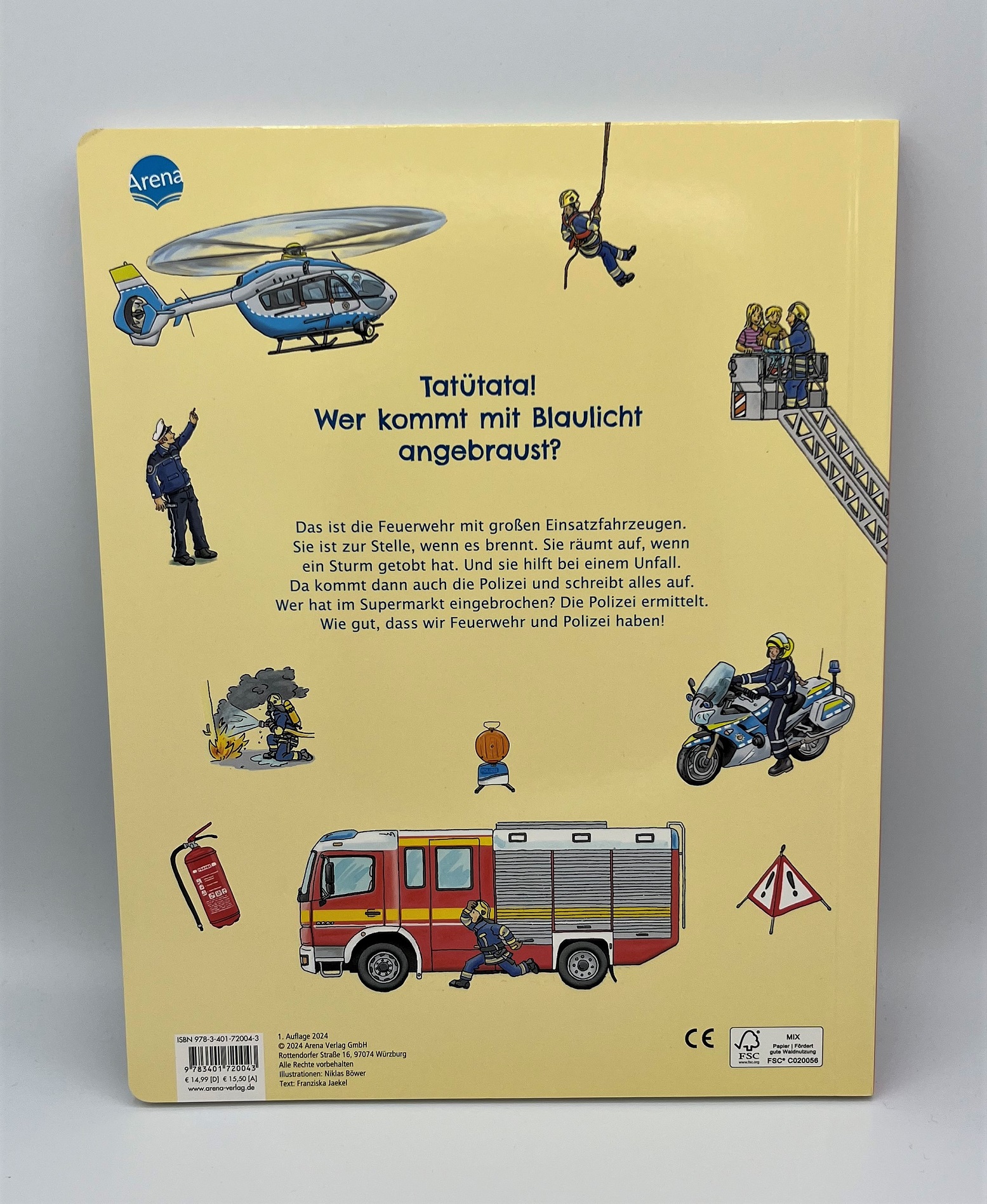 Tatütata! Wer kommt mit Blaulicht angebraust? Das ist die Feuerwehr mit großen Einsatzfahrzeugen. Sie ist zur Stelle, wenn es brennt. Sie räumt auf, wenn ein Sturm getobt hat. Und sie hilft bei einem Unfall. Da kommt dann auch die Polizei und schreibt alles auf. Gab es im Supermarkt einen Einbruch? Die Polizei ermittelt. Ein Wimmelspaß voller Spannung!
