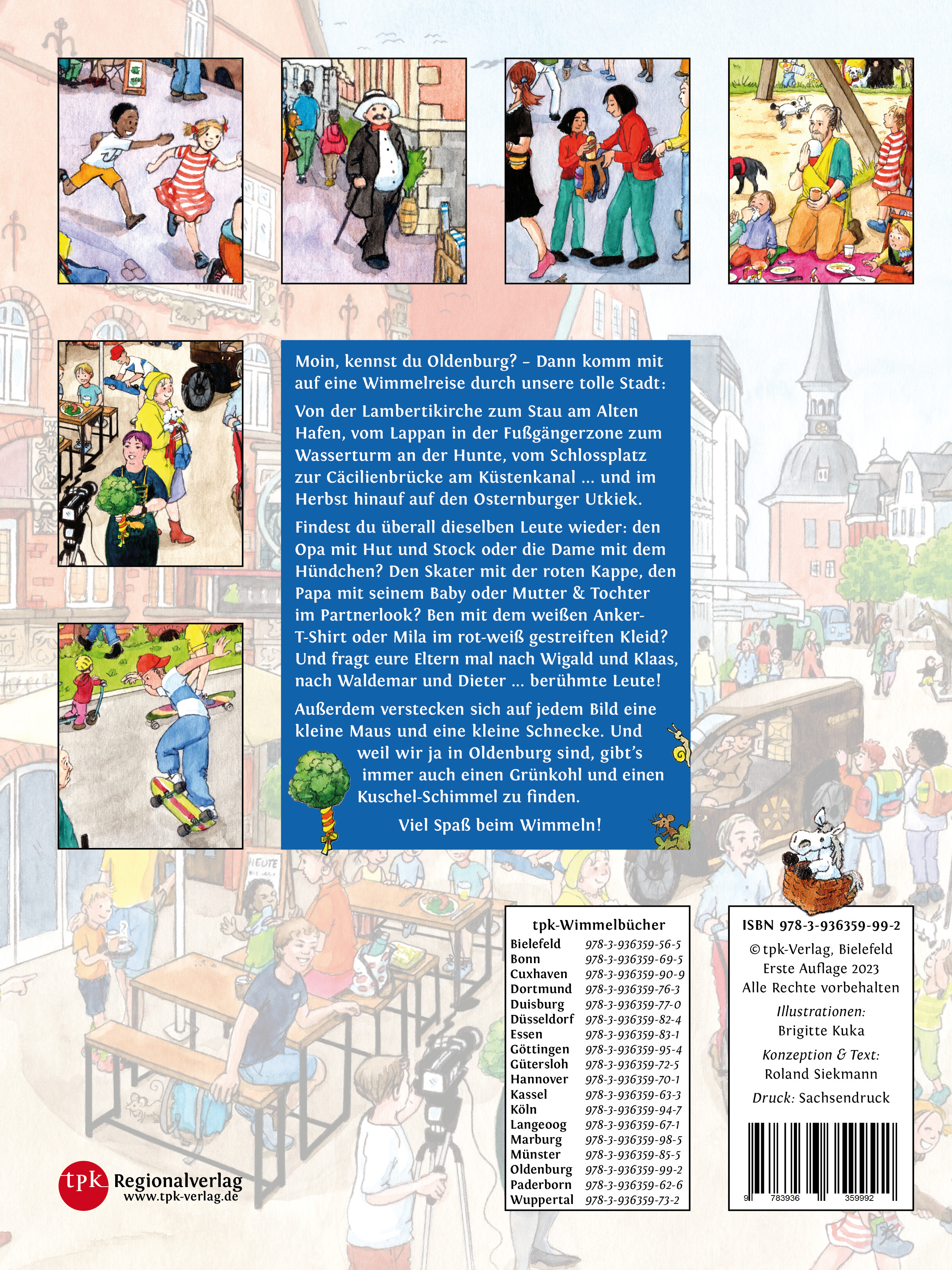 Moin, kennst du Oldenburg? - Dann komm mit auf eine Wimmelreise durch unsere tolle Stadt: Von der Lambertikirche zum Stau am Alten Hafen, vom Lappan in der Fußgängerzone zum Wasserturm an der Hunte, vom Schloßplatz zur Cäcilienbrücke am Küstenkanal ... und im Herbst hinauf auf den Osternburger Utkiek.Findest du überall dieselben Leute wieder: den Opa mit Hut und Stock oder die Dame mit dem Hündchen? Den Skater mit der roten Kappe, den Papa mit seinem Baby oder Mutter & Tochter im Partnerlook? Ben mit dem weißen Anker- T-Shirt oder Mila im rot-weiß gestreiften Kleid? Und fragt eure Eltern mal nach Wigald und Klaas, nach Waldemar und Dieter ... berühmte Leute!Außerdem verstecken sich auf jedem Bild eine kleine Maus und eine kleine Schnecke. Und weil wir ja in Oldenburg sind, gibt's immer auch einen Grünkohl und einen Kuschel-Schimmel zu finden. Viel Spaß beim Wimmeln!
