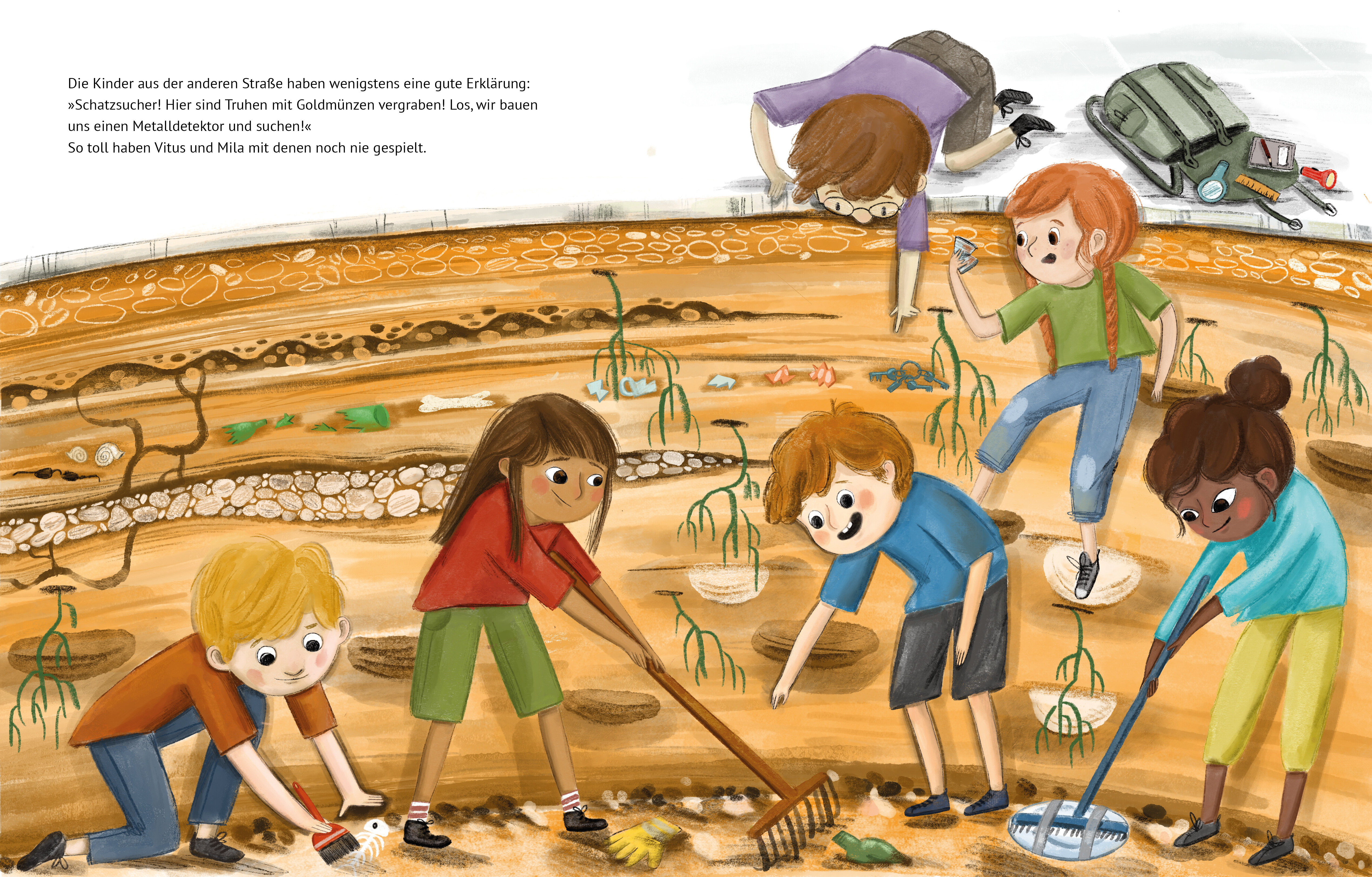 Niemand hat ihn gesehen, aber es soll ein kleiner Bagger gewesen sein, der das Loch in Vitus´ und Milas Straße gebuddelt hat. Sofort spekulieren die Erwachsenen, wozu es gut sein soll. Die Kinder grinsen nur.