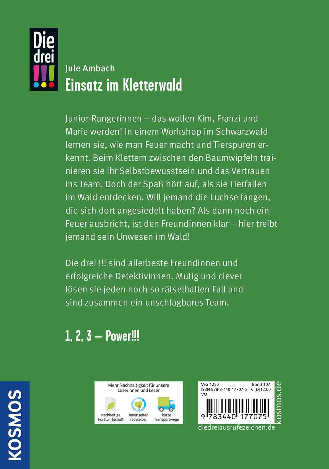 Die Idylle trügt! Die drei !!! verbringen eine aufregende Woche im Schwarzwald. In Dachsmoos lassen sie sich zu Junior-Rangerinnen ausbilden und sind den ganzen Tag in der Natur unterwegs. Der angrenzende Kletterwald wird für Selbstbewusstseins- und Teamübungen genutzt. Doch irgendwie stimmt hier etwas nicht. Wer erpresst den Besitzer der Pension? Wer stellt gemeine Tierfallen im Wald auf? Wer hat es auf die Luchse abgesehen? Als auch noch ein Brand ausbricht, gibt es keinen Zweifel mehr: Kim, Franzi und Marie stecken mittendrin in ihrem nächsten Fall. Ein spannender Krimi - nicht nur für Wald- und Kletterfans.