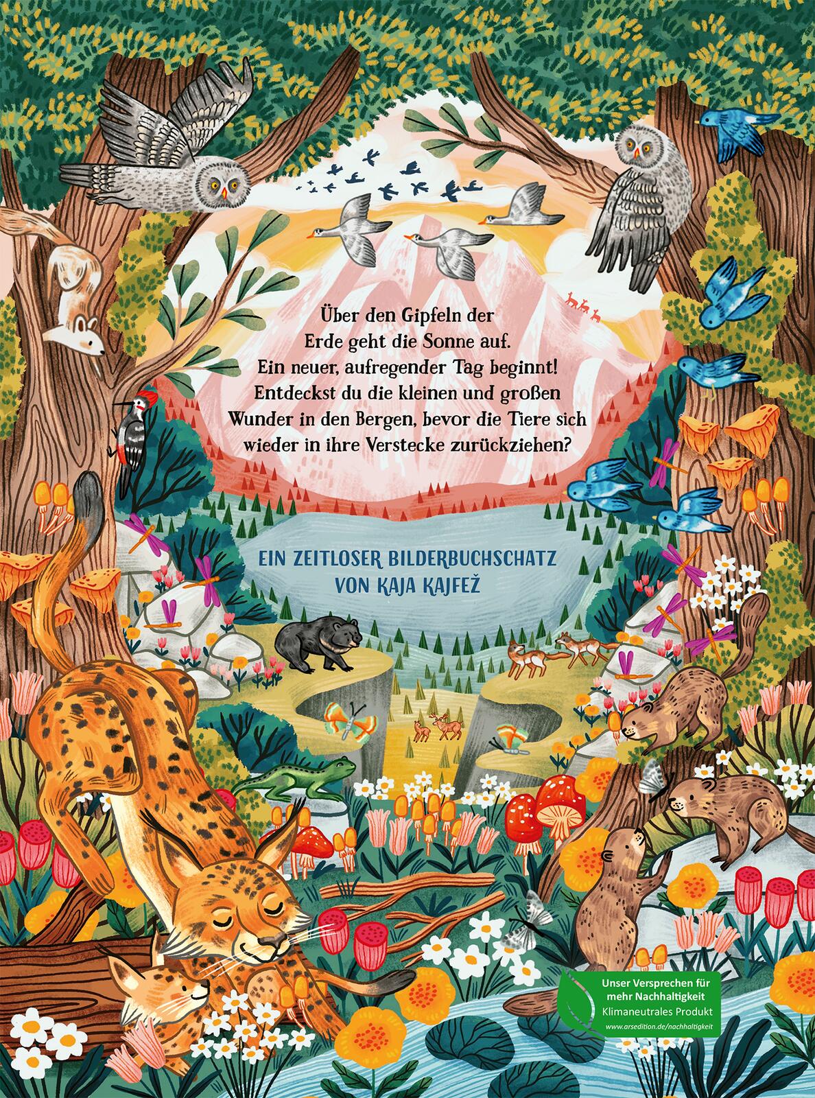 Im Himalaya kitzelt die Morgensonne das Fell einer Schneeleopardenfamilie, hoch über den Anden kreist ein Kondor und am Brocken spielen die kleinen Luchse. Was sie heute wohl alles erleben werden? Auf jeder Seite gibt es eine neue Bergwelt zu entdecken: vom Himalaya bis zu den Rocky Mountains, von den Anden bis zum Uralgebirge. Kannst du all die großen und kleinen Wunder finden, bevor sich der Tag dem Ende zuneigt und es für uns Zeit ist, Gute Nacht zu sagen?
