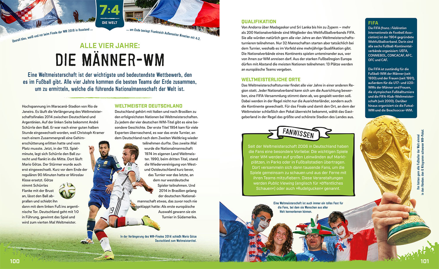 Wer hat die letzte WM gewonnen? Wie heißt die erste englische Liga? Und was ist nochmal Abseits? In diesem super Fußballbuch steht alles drin, was fußballbegeisterte Kids wissen wollen. In 11 Kapiteln kann man sich zu Spielregeln, Ausrüstung, Vereinen, Bundesliga, Nationalmannschaften, Meisterschaften, Frauenfußball und vielem mehr umfassend informieren. Interessante Rekorde und Kuriositäten sind ebenso enthalten wie ein Extra zu Taktik und Technik - für alle, die genauso erfolgreich spielen möchten wie Messi und Lewandowski. Die Texte sind leicht verständlich geschrieben und mit über 600 Fotos und Zeichnungen anschaulich bebildert. Das ultimative Buch zum absoluten Lieblingssport!