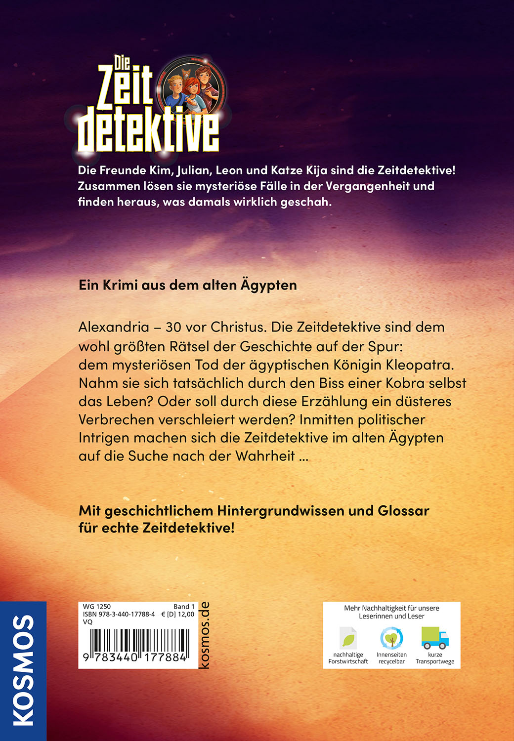 Zeitreise ins Alte Ägypten! Kleopatra wird tot in ihren Gemächern aufgefunden. Starb die berühmte Königin wirklich an den Folgen eines Schlangenbisses? Die Zeitdetektive Leon, Julian, Kim und Katze Kija wollen es genau wissen. Sie reisen weit zurück in die Vergangenheit. Bei ihren Ermittlungen geraten die Freunde selbst in große Gefahr und bekommen es mit einem düsteren Giftmischer zu tun. Wie lebten die Menschen im Jahr 30 vor Christus? Wie waren sie gekleidet? Wie sahen ihre Häuser aus? Ein aufregender Kriminalfall mit umfangreichen Sachinfos. Eintauchen und mit den Zeitdetektiven Geschichte hautnah erleben.
