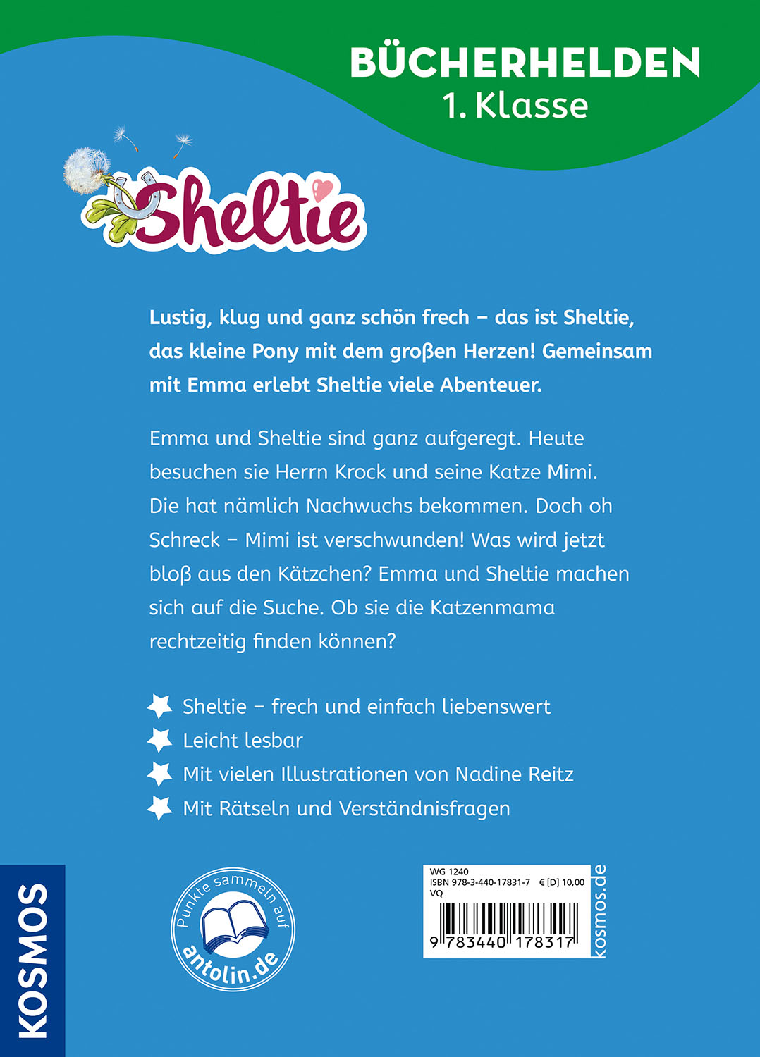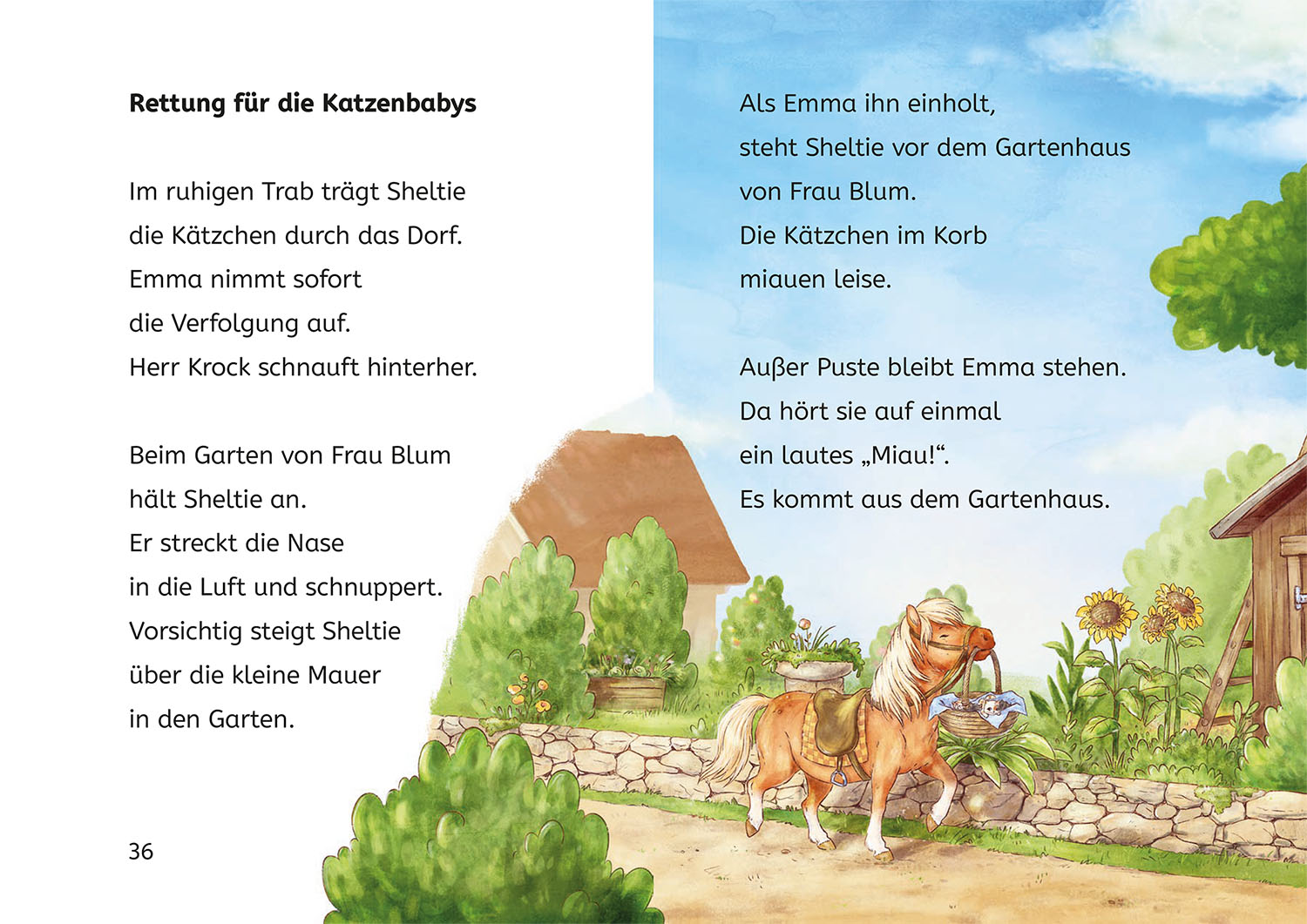 Wo steckt denn nur die Katzenmutter? So lange sie weg ist, kümmern sich Emma und ihr Shetlandpony Sheltie liebevoll um die Katzenkinder. Was ist jetzt mit Sheltie los? Das Pony bleibt beim Ausreiten immer wieder regungslos an einem Obstgarten stehen. Eines Tages schnappt sich Sheltie plötzlich den Tragekorb, in dem die Kätzchen liegen, und trabt mit ihnen zum Garten. Im Gartenhäuschen ist doch ein Miauen zu hören. Sheltie hat die Katzenmutter gefunden! Eine aufregende Geschichte in sechs Kapiteln, die jeweils mit einem Leserätsel enden. Mit vielen tollen Bildern und leicht lesbarer Fibelschrift.