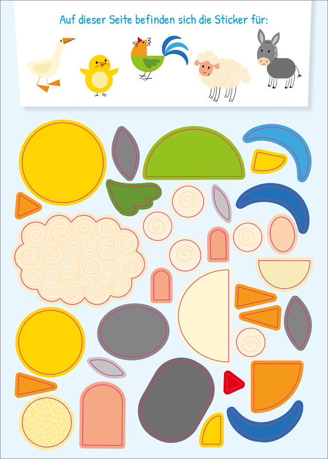 Auf der Wiese fehlt doch was? Und auch der Teich ist ziemlich leer! Kein Wunder, denn die Bauernhoftiere müssen erst noch zusammengesetzt werden. Eine kleine Schritt-für Schritt-Anleitung hilft den Kindern, die passenden Sticker zu finden und richtig aneinanderzustickern. Fehlende Details wie Augen, Schwanz oder Pfoten, werden einfach auf den beschreibbaren Sticker oder direkt im Bild ergänzt. So entstehen 15 niedliche Bauernhofmotive. Das macht Kindern nicht nur riesigen Spaß, sondern trainiert nebenbei ihre Feinmotorik und Konzentration.