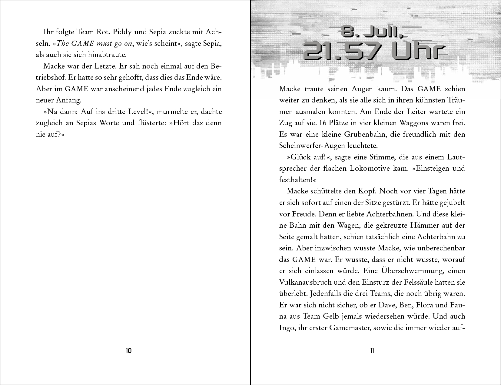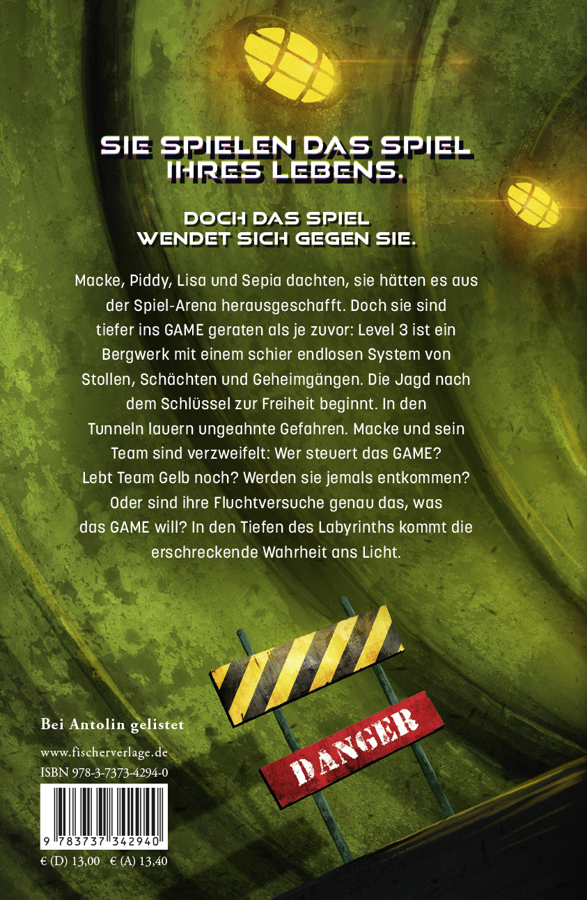 Macke, Piddy, Lisa und Sepia dachten, sie hätten es aus der Spiel-Arena heraus geschafft, dabei sind sie tiefer ins GAME geraten als je zuvor: Level 3 ist ein Bergwerk mit einem schier endlosen System von Stollen, Schächten und Geheimgängen. Die Jagd nach einem Schlüssel zur Freiheit beginnt. In den düsteren Tunneln lauern ungeahnte Gefahren. Macke und sein Team sind verzweifelt: Wer steuert das GAME? Lebt Team Gelb noch? Werden sie es jemals schaffen, zu entkommen? Oder tun sie mit ihren Fluchtversuchen genau das, was das GAME will? In den Tiefen des Labyrinths kommt die erschreckende Wahrheit ans Licht.