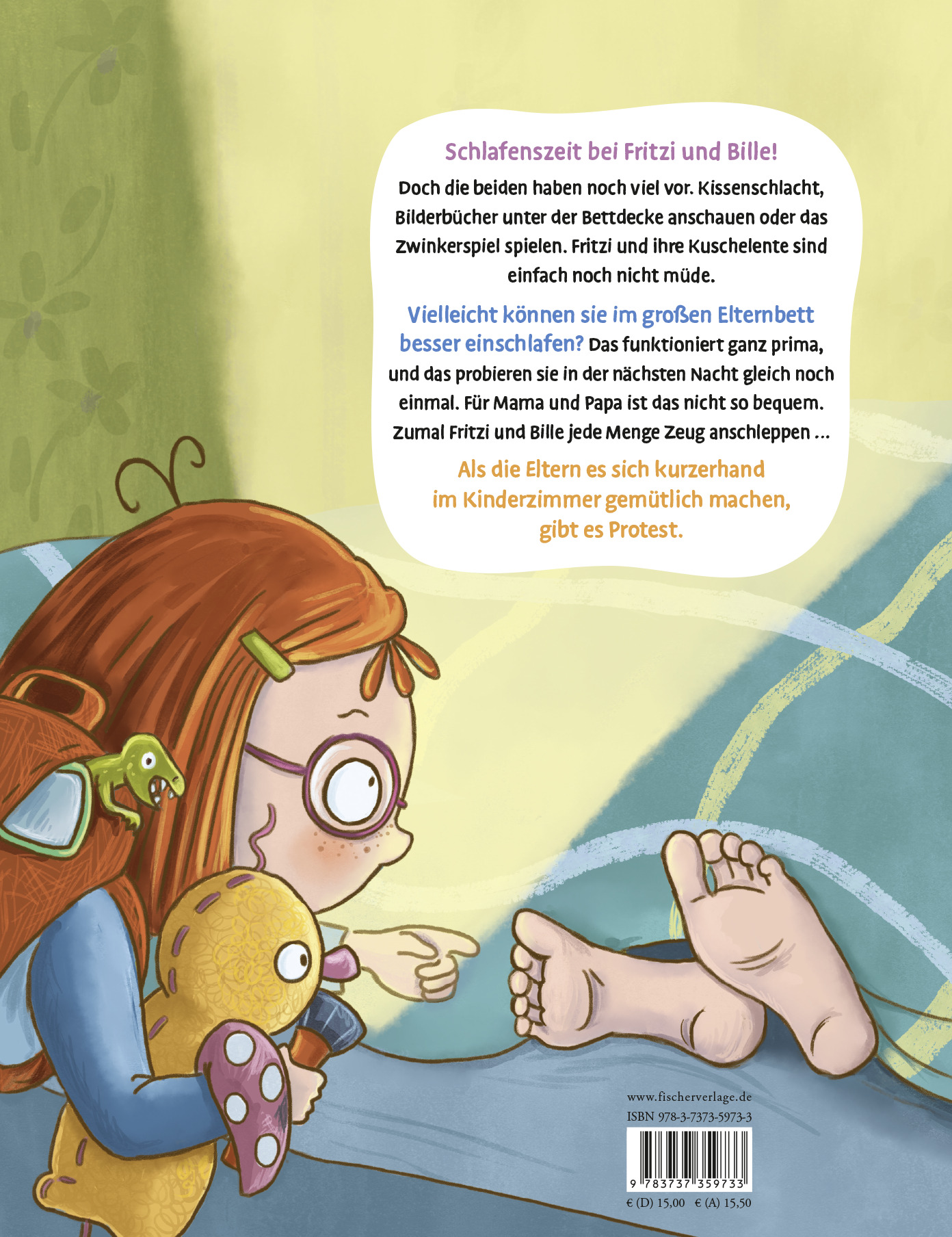 Wenn bei Fritzi und und ihrer Lieblingskuschelente Bille Schlafenszeit ist, haben die beiden noch viel vor. Kissenschlacht, Bilderbücher unter der Bettdecke anschauen oder das Zwinkerspiel spielen. Fritzi und ihre Kuschelente sind einfach noch nicht müde. Vielleicht können sie im großen Elternbett besser einschlafen? Das funktioniert ganz prima, und das probieren sie in der nächsten Nacht wieder. Für Mama und Papa ist das nicht so bequem. Zumal Fritzi und Bille jede Menge Zeug anschleppen ... Als die Eltern es sich kurzerhand im Kinderzimmer gemütlich machen, gibt es Protest.