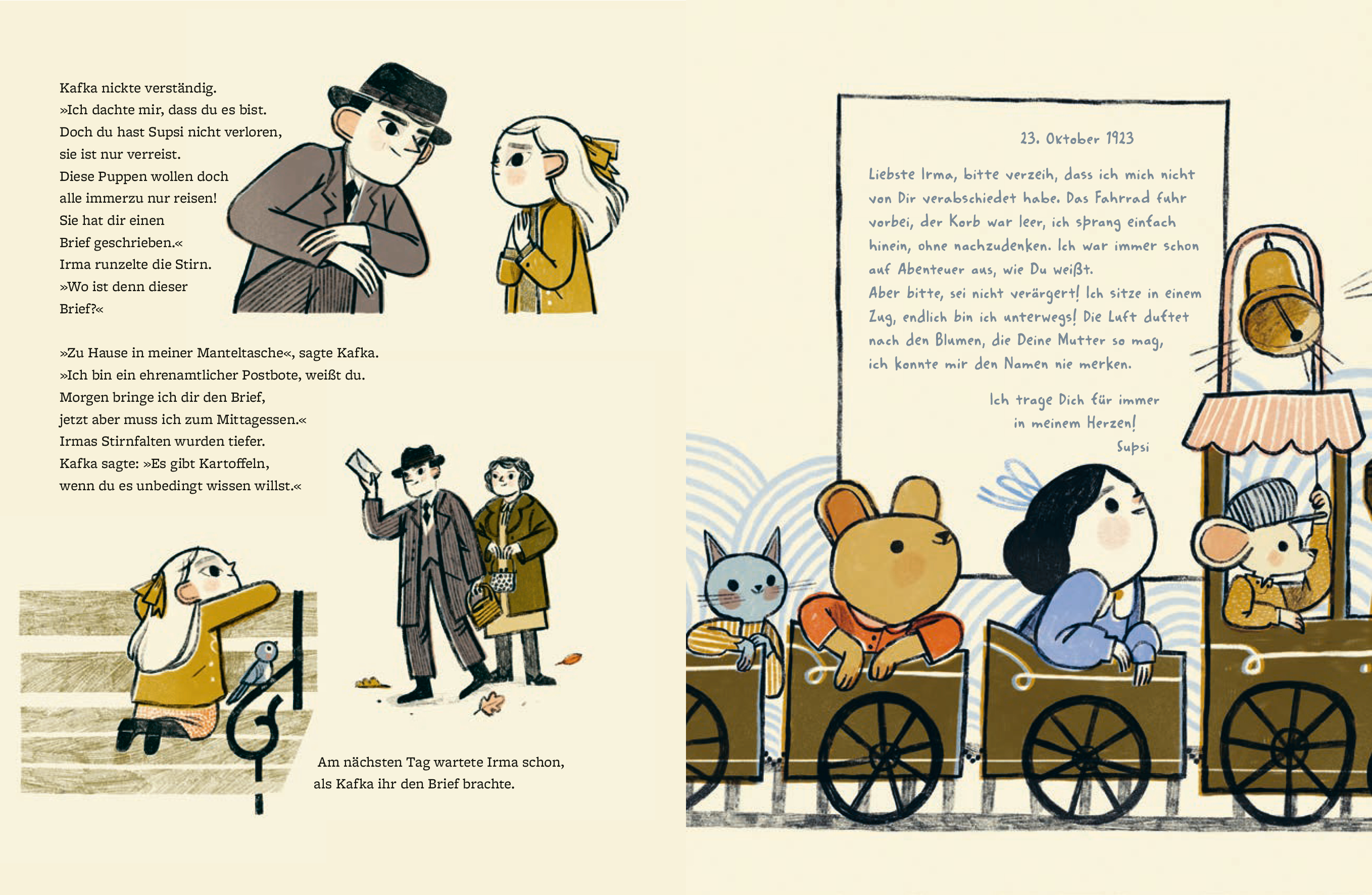 Irma ist traurig. Sie hat Supsi verloren, ihre liebste Puppe. Herr Kafka erspürt Irmas Not und beginnt zu erzählen. Dass die Puppe auf Weltreise ist und ganz bestimmt Briefe schicken wird. Und tatsächlich. Tag für Tag bringt Herr Kafka Briefe von Supsi mit. Die Puppe berichtet von Abenteuern in fernen Ländern, von Croissants zum Frühstück, Tee mit Peter Hase und den Pyramiden in Ägypten. Ein großer Trost für Irma! Aber sie weiß jetzt auch, dass Supsi nicht wiederkommt. Auch Herr Kafka bringt eines Tages keine Briefe mehr ...