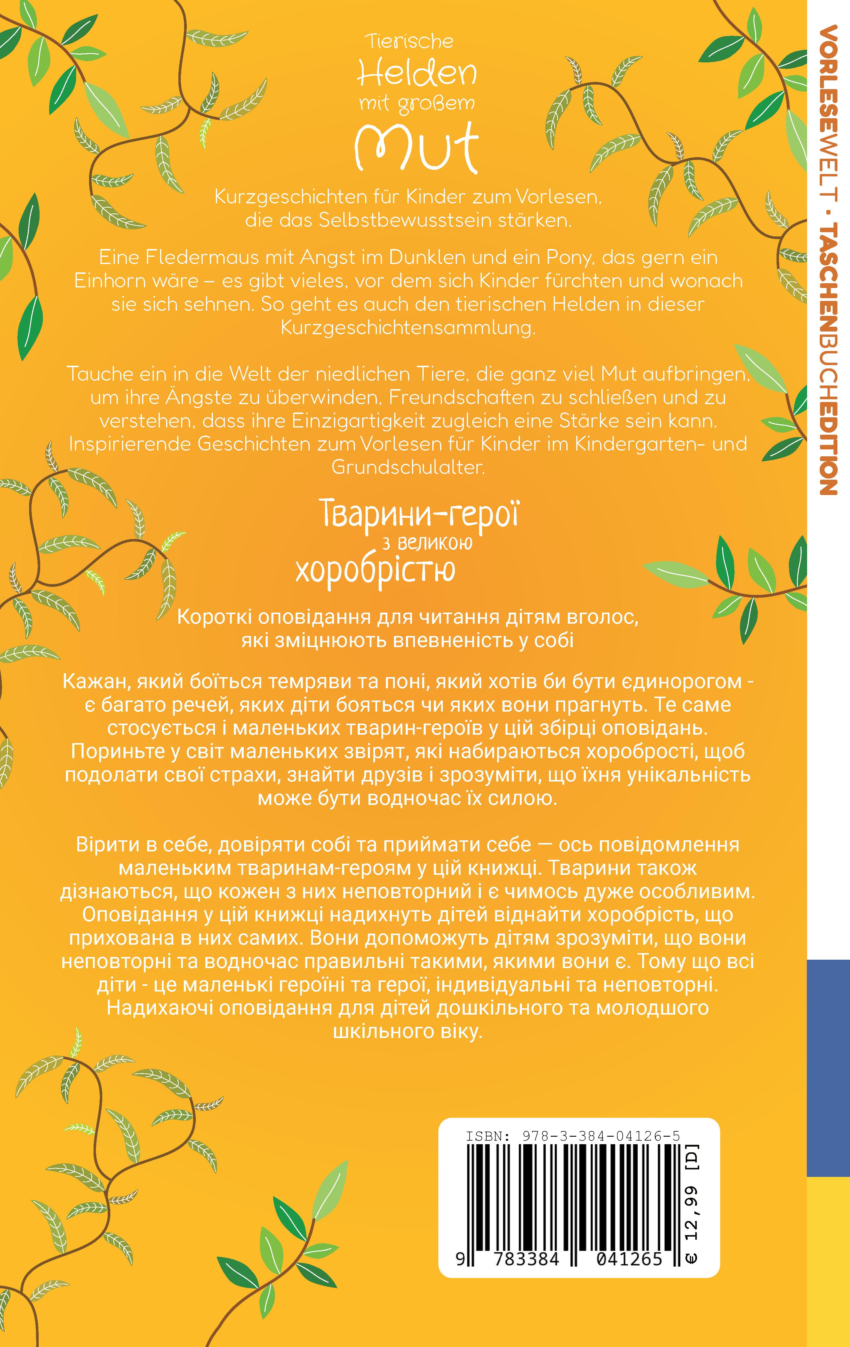 Erschienen ist dieses Vorlesebuch im Taschenbuchformat als bilinguale Ausgabe in Deutsch und Ukrainisch. Eine Fledermaus mit Angst im Dunklen und ein Pony, das gern ein Einhorn wäre - es gibt vieles, vor dem sich Kinder fürchten und wonach sie sich sehnen. So geht es auch den kleinen tierischen Helden in dieser Kurzgeschichtensammlung. Tauche ein in die Welt der niedlichen Tiere, die ganz viel Mut aufbringen, um ihre Ängste zu überwinden, Freundschaften zu schließen und zu verstehen, dass ihre Einzigartigkeit zugleich eine Stärke sein kann. An sich selbst zu glauben, sich selbst zu vertrauen und sich selbst zu akzeptieren, das sind die Botschaften für die tierischen Helden in diesem Taschenbuch. Dabei lernen die Tiere auch, dass jedes von ihnen einzigartig und etwas ganz Besonderes ist. Die Geschichten in diesem Taschenbuch sollen Kinder inspirieren, den Mut, der in ihnen verborgen ist, zu finden. Sie sollen Kindern helfen zu verstehen, dass sie, so wie sie sind, einzigartig und zugleich genau richtig sind. Denn alle Kinder sind kleine Heldinnen und Helden, ganz individuell und einzigartig. Mit dabei sind große Tiere wie ein Pony, ein Bär und eine Giraffe, aber auch ganz kleine Tiere, wie eine Blattlaus. Daneben gibt es Geschichten mit einer Fledermaus, einem Eichhörnchen, einem Hasen und einer Waldmaus. Doch auch ein Schwein, eine Ziege und eine Schnecke spielen in dieser Kurzgeschichtensammlung eine Rolle. Bestimmt findet jedes Kind ein Tier, mit dem es sich identifizieren kann. Enthalten sind insgesamt 10 inspirierende Geschichten zum Vorlesen für Kinder im Kindergarten- und Grundschulalter: - Der kleine Bär - Die wolligweiche Ziege - Die einsame Blattlaus - Das Eichhörnchen mit Höhenangst - Die immer niesende Schnecke ... hatschi! - Der verirrte Feldhase - Die riesengroße Giraffe - Die Fledermaus, die sich im Dunklen fürchtet - Das Pony, das wünschte ein Einhorn zu sein - Das arme Schwein Das Taschenbuch ist liebevoll illustriert mit kleineren und größeren Schwarzweißbildern auf jeder einzelnen Seite. Zu Beginn jeder einzelnen Geschichte findet sich ein Bild des tierischen Helden der jeweiligen Geschichte. Der deutsche und ukrainische Text stehen sich auf jeder Doppelseite gegenüber, so kann beim Lesen oder Vorlesen auch die jeweils andere Sprache mitgelesen und erlernt werden.