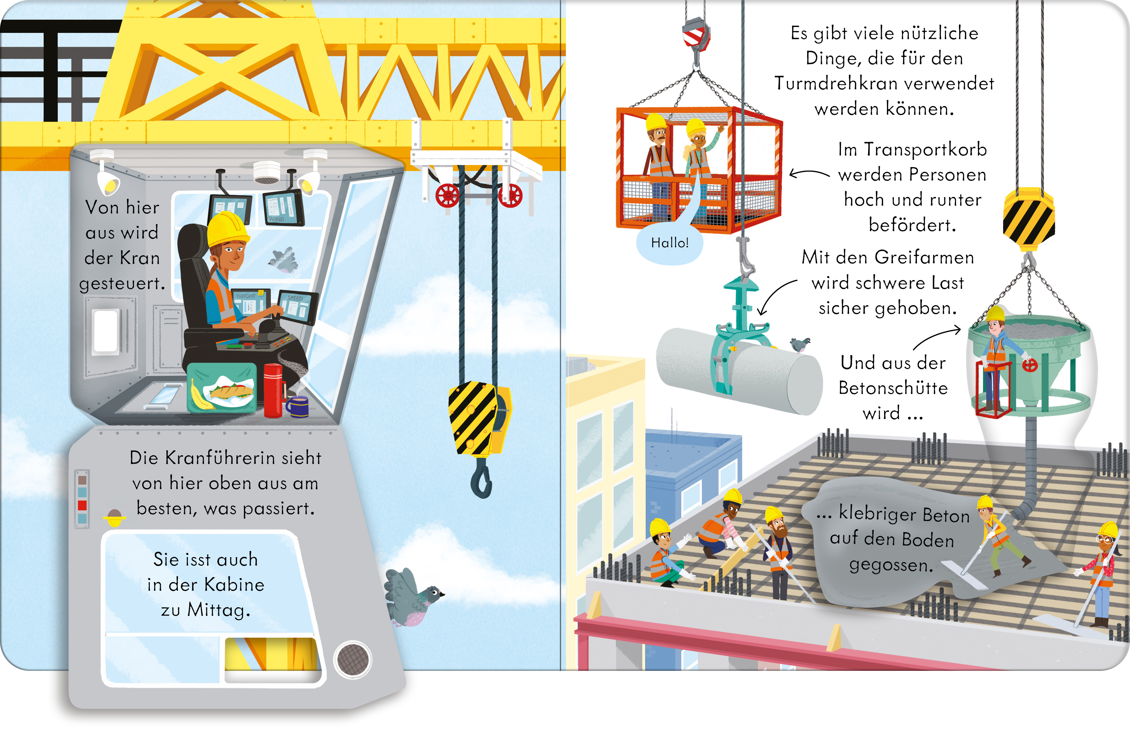 altersgerechtes Klappenbuch mit spannenden Einblicken in die verschiedenen Kräne auf Baustellen sowie ihre Funktionsweise – ab 3 Jahren