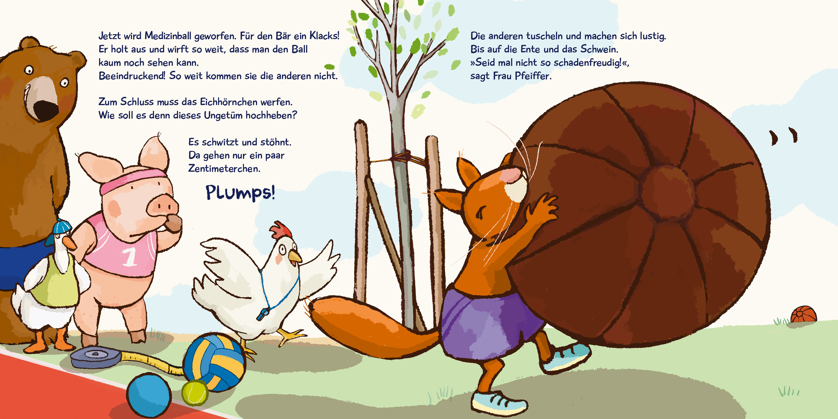Heute ist großer Wettkampf bei den Tieren! Es wird gelaufen, geworfen, geklettert und geschwommen. Anfangs macht sich das flinke Eichhörnchen noch über die lahme Ente und das kurzbeinige Schwein lustig. Bis sie dann im Schwimmbecken an ihm vorbeiziehen. Es hat eben jeder seine eigene Qualität - und so richtig Spaß macht es erst, wenn man gemeinsam über die Stärken und Schwächen lachen kann.
