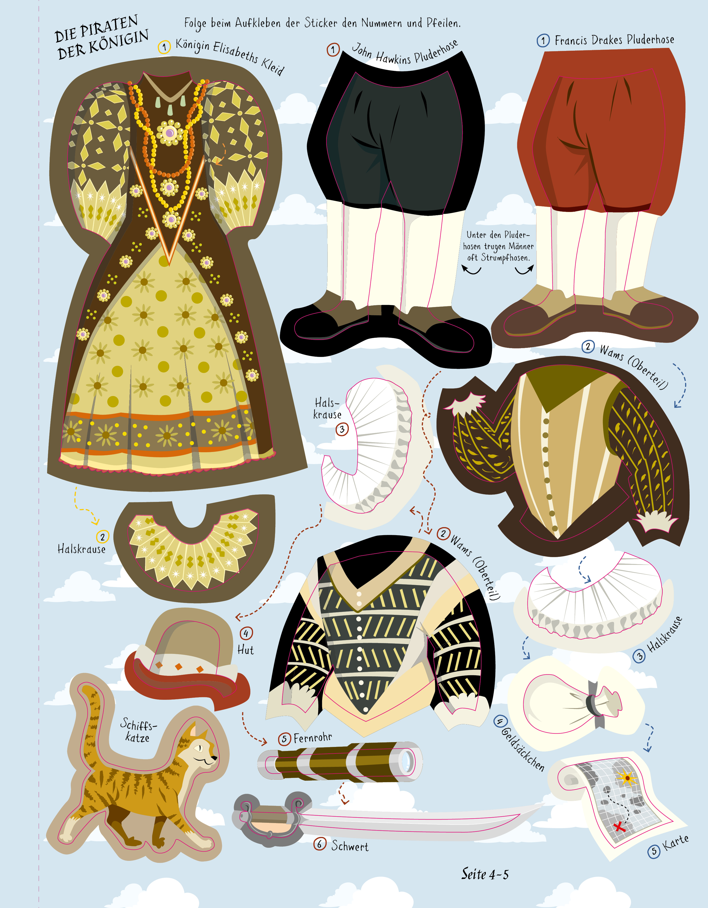 - Mit über 150 Stickern können die Piraten angekleidet und mit Fernrohr, Säbel u. v. m. ausgestattet werden