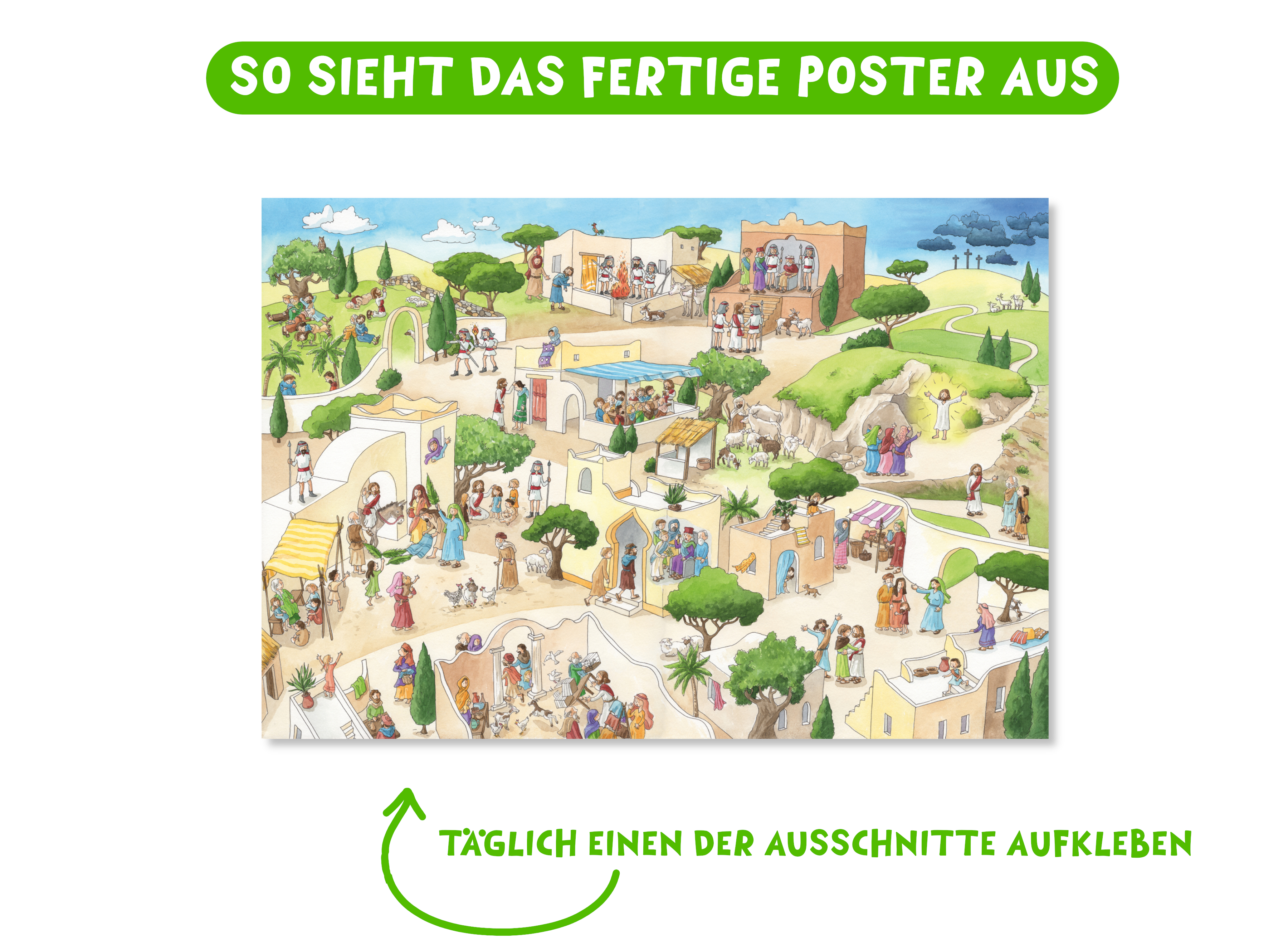 | Schlagworte | Abendmahl • Auferstehung • Ausschneiden • Basteln • Biblische Geschichte • Jerusalem • Jesus • Kinder • Kinderbuch • Kreuzigung • Osterbuch • Ostergeschichte • Osterkalender • Ostern • Passion • Poster • Poster-Kalender • Religiös • Vorlesen |