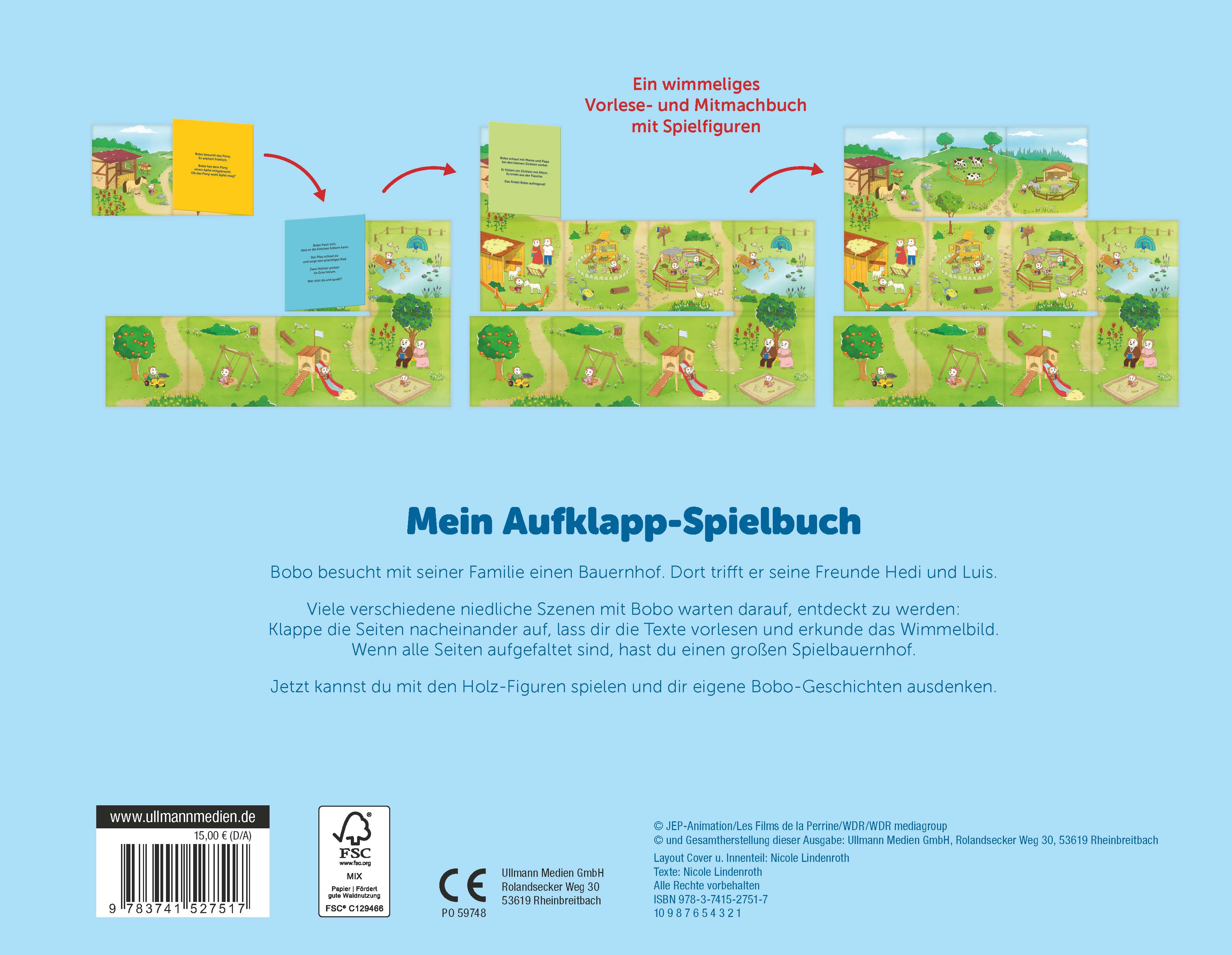 Neben den kleinen bezaubernden Texten gibt es auch viel auf den Seiten zu entdecken. Das Tolle ist hierbei: Dieses Buch kann man aufklappen und erhält eine wundervolle Spielfläche auf der es viel zu erleben gibt. Hinzu kommen noch drei Figuren. Somit können Bobo und seine Eltern auf den Bauernhof und Spielplatz gehen, an den Teich spazieren oder gemeinsam Zeit mit Oma und Opa verbringen.