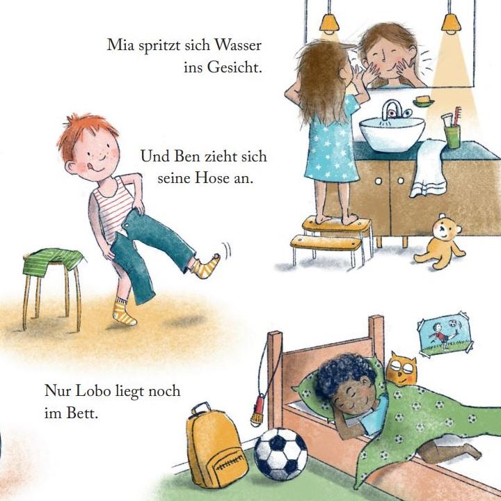 Die erste Schulwoche ist vorbei. Lobo, Lotte, Mia, Finn und Ben sind schon echte Freundinnen und Freunde geworden. Ab jetzt wollen sie auch den Schulweg gemeinsam meistern. Doch bis der Schultag starten kann, gibt es viel zu tun: Zähne putzen, anziehen, frühstücken, rechtzeitig losgehen ...