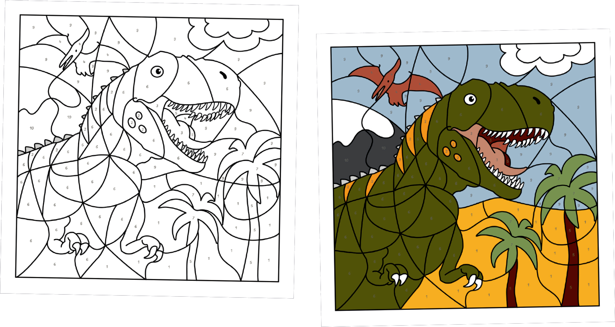 Ein Block mit 32 aufregenden Malen nach Zahlen-Motiven für Dino-Fans!