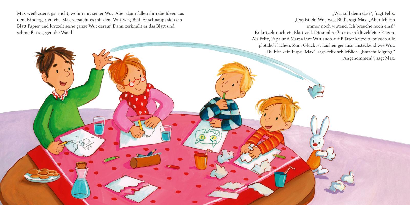Wut ist ein Gefühl, das jeder Mensch kennt. Für Kindergartenkinder ist es oft schwierig, mit diesem starken Gefühl umzugehen. In diesem Bilderbuch lernen Kinder verschiedene Auslöser und Ursachen für Wut kennen. Und vor allem zeigt ihnen die Geschichte, wie sie ihren Ärger ausdrücken und loswerden können, ohne sich selbst und anderen zu schaden.