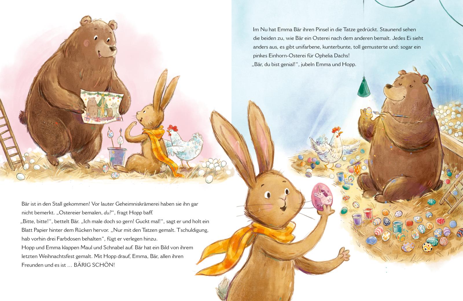 Häschen Hoppel hat gute Laune, bis der Liefer-Dachs an seine Tür klopft. Mitten zwischen den warmen Strahlen der Morgensonne, den duftenden Frühlingskräutern und wunderschön bunten Blüten steht der Dachs mit seinem Lieferwagen voller Farbeimer. Schließlich ist bald Ostern, Zeit, die bunten Eier anzufertigen! Leider ist das Bemalen der Ostereier nicht gerade Hoppels Lieblingsbeschäftigung. Mit Henne Emma und Bär kommt der Hase auf eine tolle Idee: Er muss gar nicht alles allein vorbereiten. Natürlich muss die Zusammenarbeit der drei Tiere vor dem Fest geheim bleiben. Was würden sonst die anderen Tiere vom Osterhasen halten?
