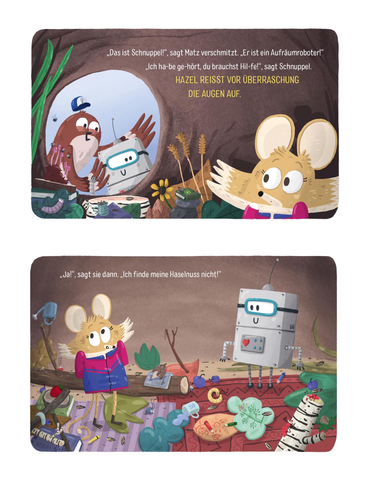 Wie aus dem Nichts taucht zum Glück ein kleiner Roboter auf, der heißt Schnuppel, und er liebt es aufzuräumen. Im Nu ist die Baumhöhle ordentlich wie nie zuvor. Hazel findet das gut und Schnuppel fühlt sich wohl - ein bisschen zu wohl irgendwie. Er bleibt bei Hazel, verbringt viel Zeit mit ihr und bemerkt, dass er gar nicht wusste, wie schön es ist, faul zu sein.