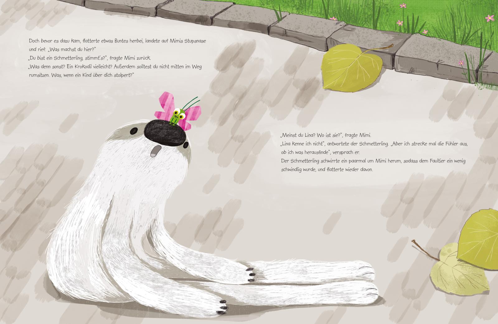 Und deswegen darf Mimi auch immer mit zur Kita kommen, auch wenn gar kein Kuscheltiertag ist. Mimi kann nämlich sehr gut auf Lina warten, in der Garderobe bei den Jacken ist es schön gemütlich und kuschelig. Aber eines Morgens passen Mimi und Lina nur ganz kurz nicht gut aufeinander auf und Mimi plumpst aus Linas Buggy. Das kleine Faultier ist ganz traurig! Sie vermisst ihr Mädchen. Lina geht es bestimmt genauso! Und deswegen setzt Mimi sich in den Kopf, Lina zu finden. Zum Glück trifft sie ein paar andere Tiere, die ihr dabei helfen.