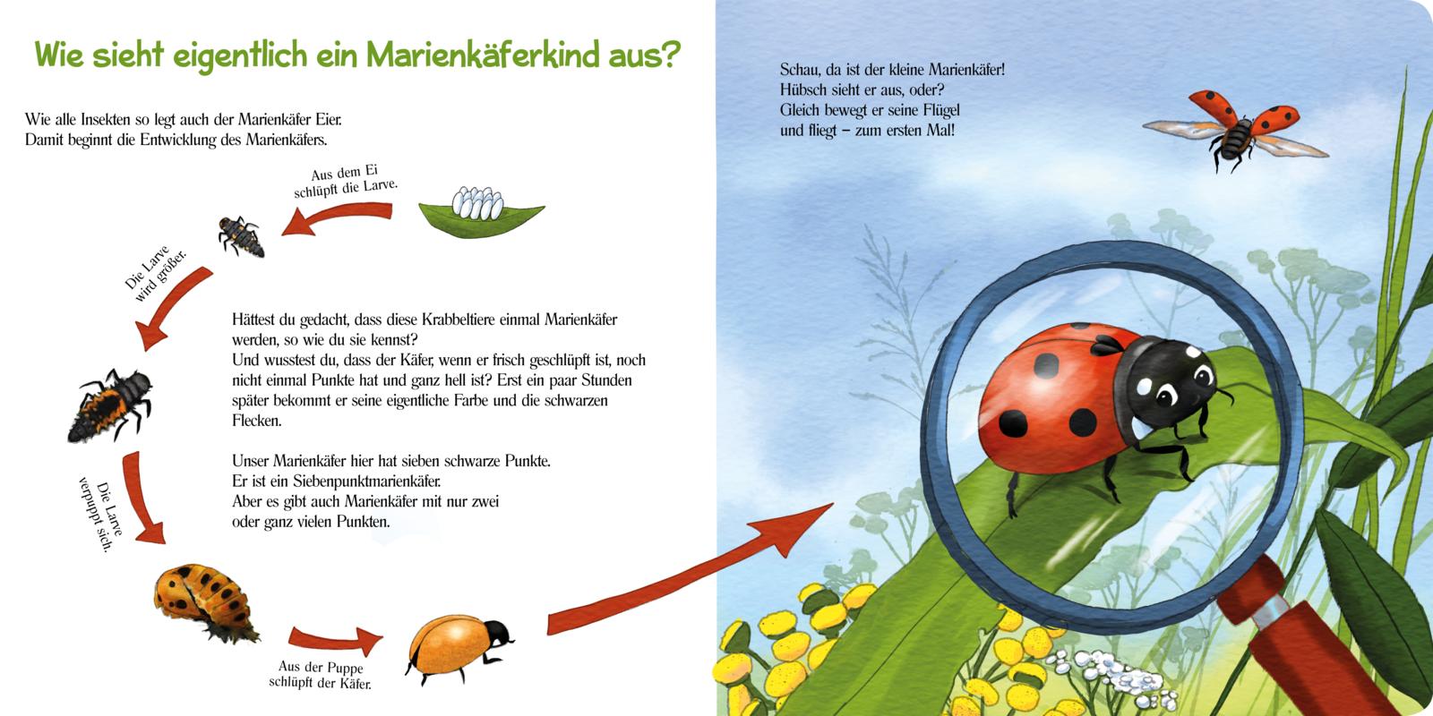 Wer kennt ihn nicht, den kleinen roten Käfer mit den schwarzen Punkten? Aber was genau wissen wir über ihn? Was frisst er am liebsten? Schläft er auch mal? Wie sieht er als Larve aus? Und gibt es noch andere Marienkäfer? Mit kleinen Vorlesegeschichten, anschaulichen Sachinformationen und spielerischen Mitmachseiten bietet dieses erste Papp-Sachbuch genau die richtige Mischung an Unterhaltung und Wissen für Kleine.