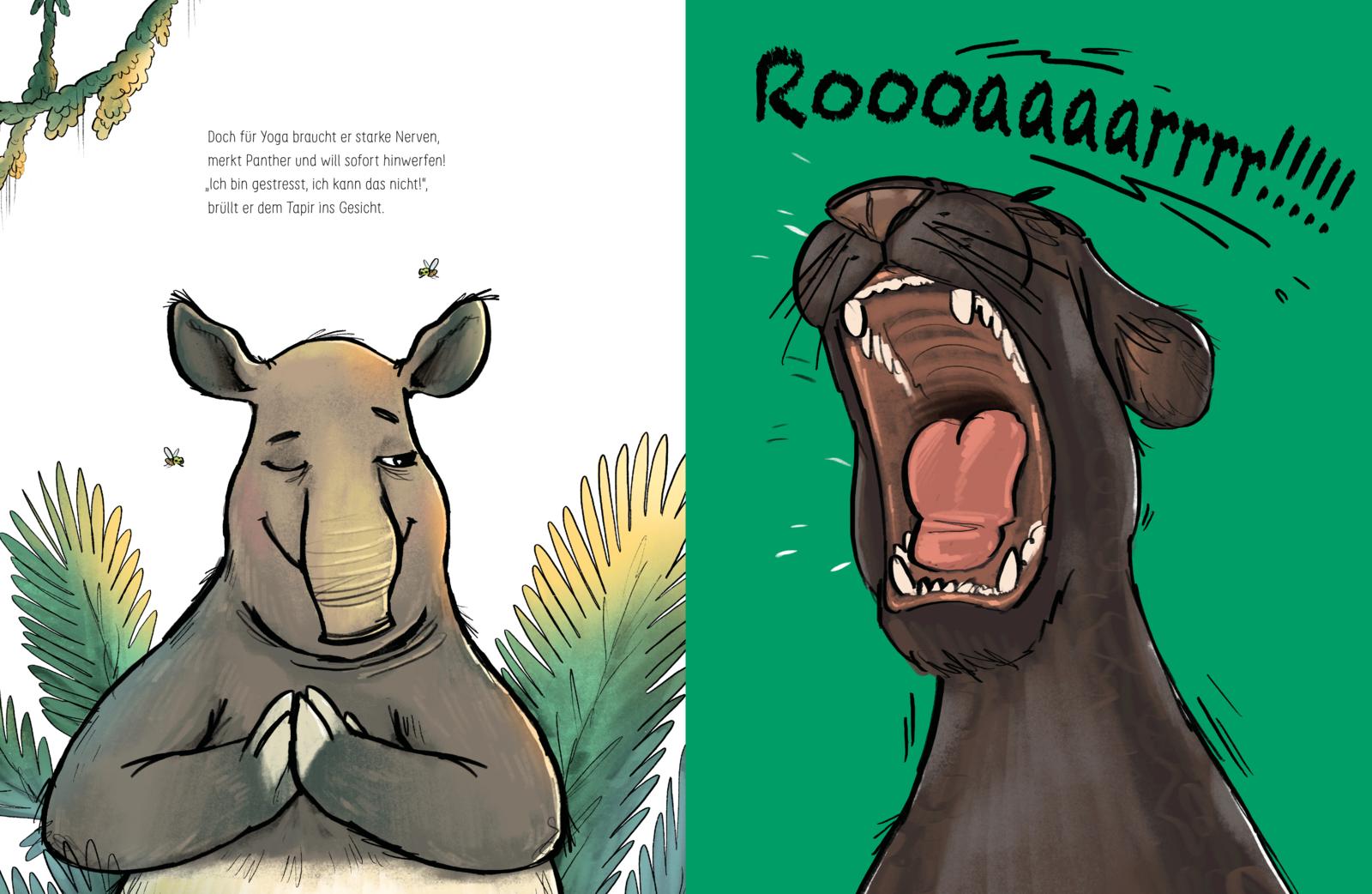 Tja, wer kennt es nicht? Es gibt so Tage, so Abende, so Momente, da fühlt man eine extreme Anspannung und Unruhe in sich drin, die einfach nicht weggehen will. Genauso geht es dem Panther. Er ist eigentlich schon ziemlich müde, aber er kommt einfach nicht zu Ruhe. Da hilft es leider auch nicht, dass alle anderen Tiere im Regenwald ihm gute Tipps geben: Einen Gang zurückschrauben, Tieryoga, bis Hundert zählen, eine Runde schwimmen gehen - alles Mist! Nichts will helfen. Die entscheidende Idee hat ausgerechnet das Faultier: