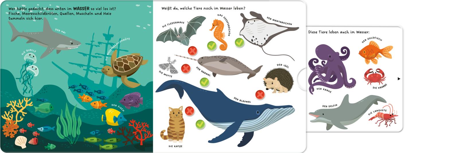 Dieses Tierbuch lädt zum Betrachten und Mitraten ein. Beim Herausziehen des Schiebers wird klar, ob die Antwort richtig war. Erscheint ein grüner Punkt dann stimmt die Antwort.