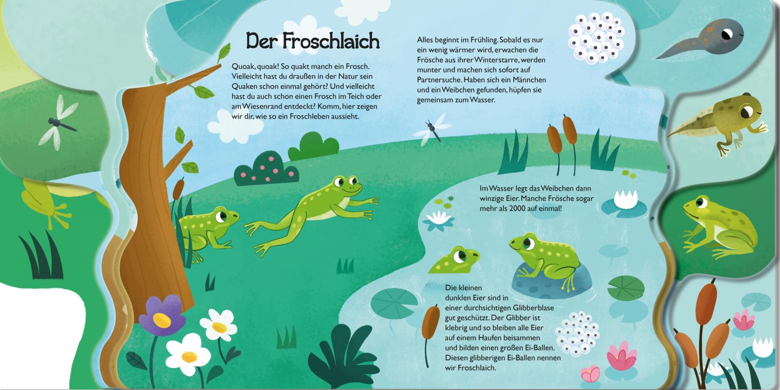 Zuerst ist es ein kleiner schwarzer Punkt in dem Ei. Dann wachsen Kopf, Körper und Schwanz heran und eine Kaulquappe schlüpft. Und wie wird aus diesem kleinen zappeligen Tier dann ein großer Frosch, der schwimmen und springen und quaken kann?