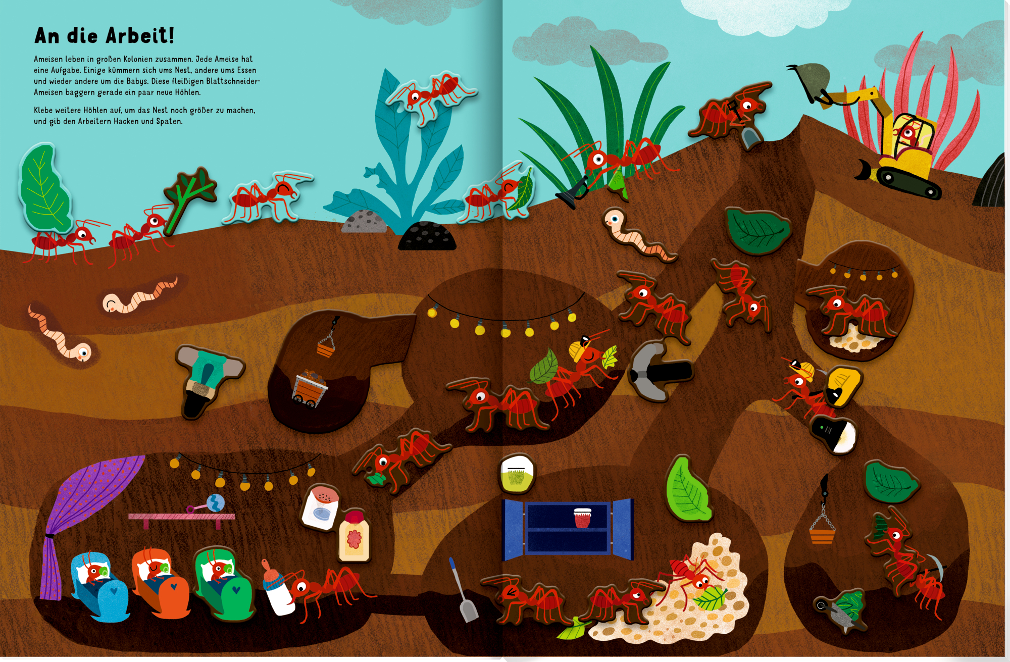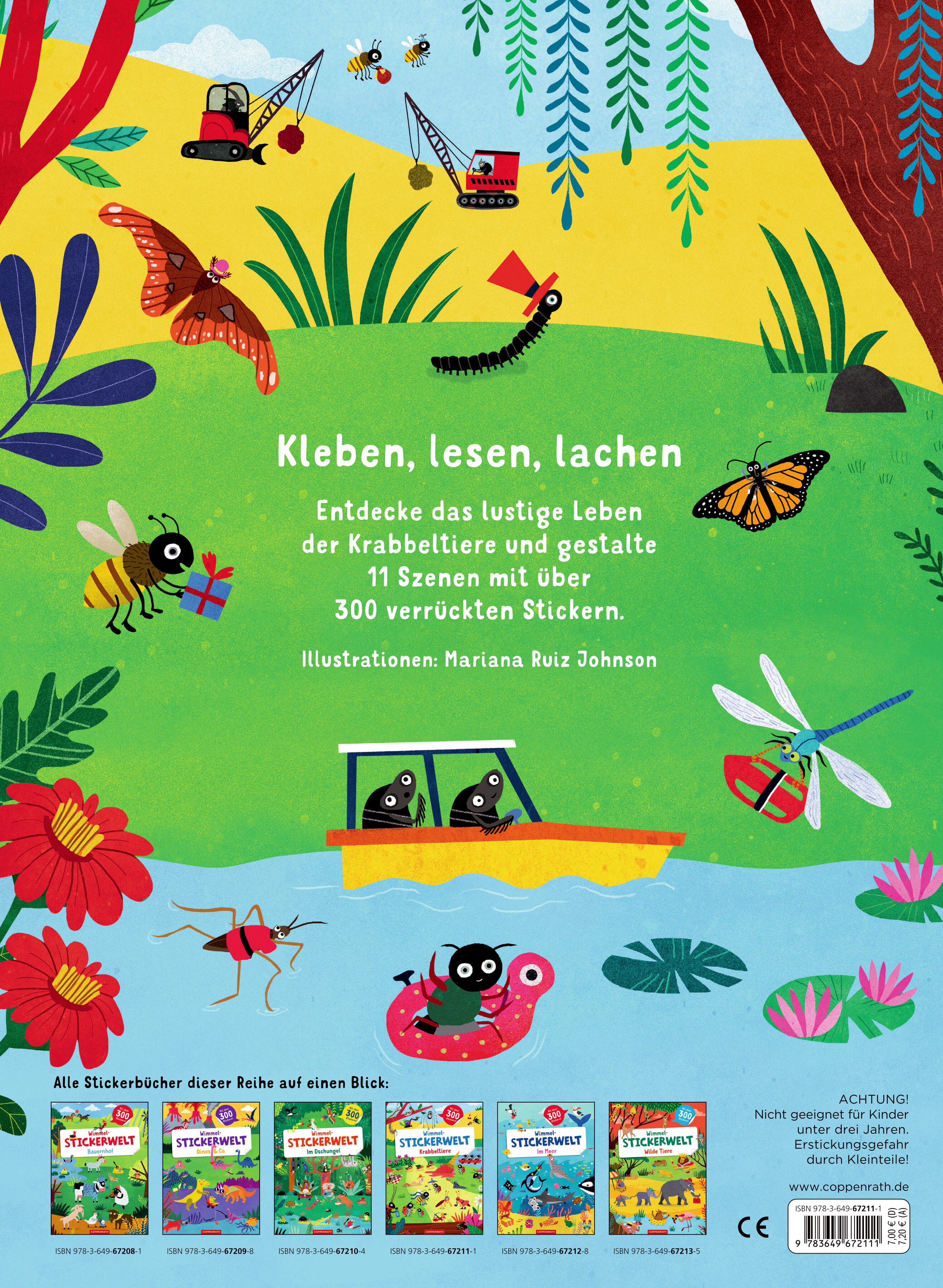 Mit diesem großformatigen Stickerheft entdecken kleine Tierfreundinnen und Tierfreunde das lustige Leben der Krabbeltiere und gestalten 11 Szenen mit über 300 verrückten Stickern.