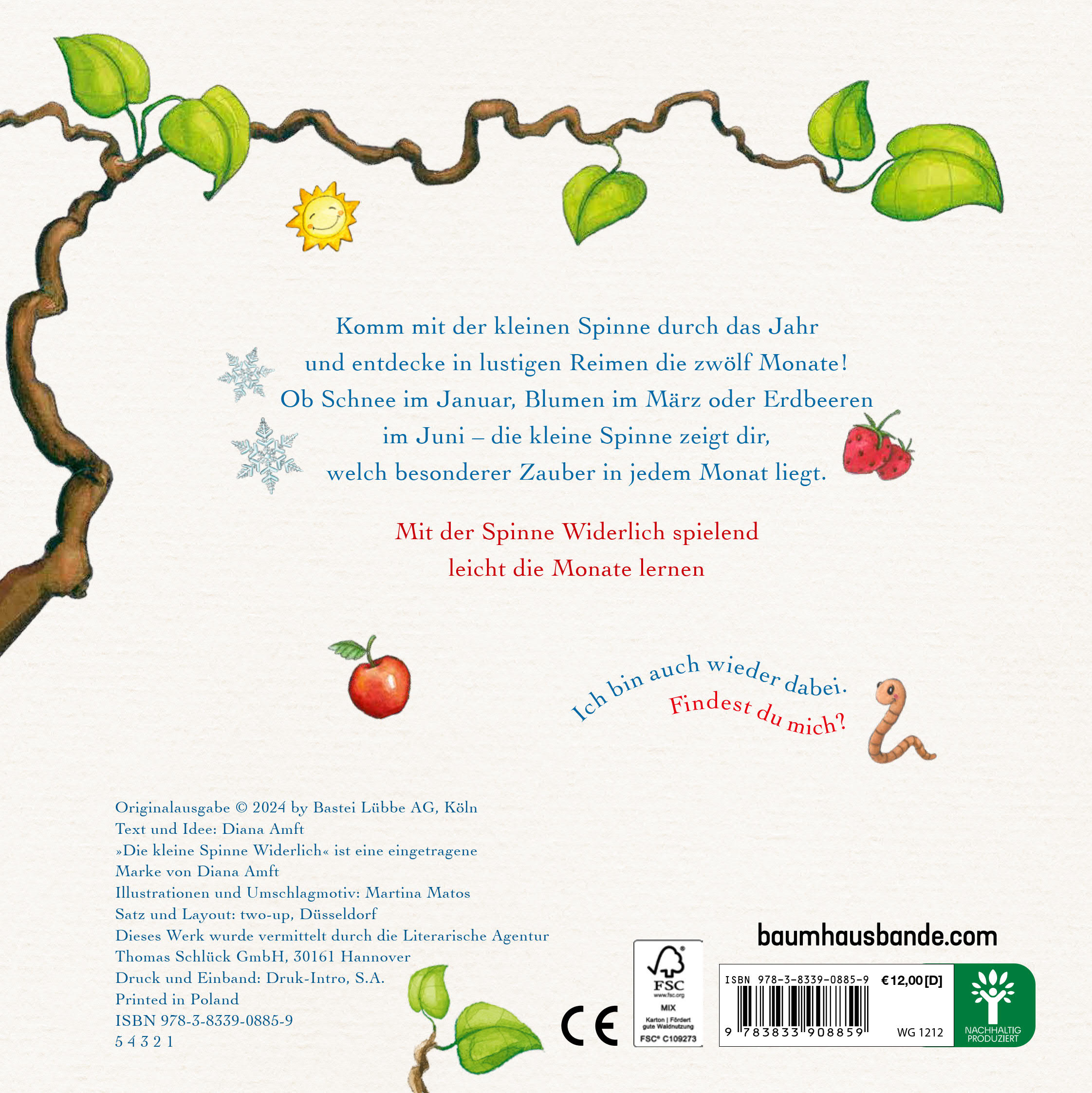 Komm mit der kleinen Spinne durchs Jahr und entdecke in lustigen Reimen die zwölf Monate. Ob den Schneemann im Februar oder Blumen im März, Erdbeeren im Juni oder Äpfel im September, ob buntes Laub im Oktober oder Kerzenstimmung im Dezember - die kleine Spinne zeigt dir, welch Zauber in jedem Monat und jeder Jahreszeit liegt. Liebevoll illustriert von Martina Matos und mit einem Monatsrätsel auf jeder Doppelseite, damit die kleinen Zuhörer:innen zeigen können, was sie schon wissen.