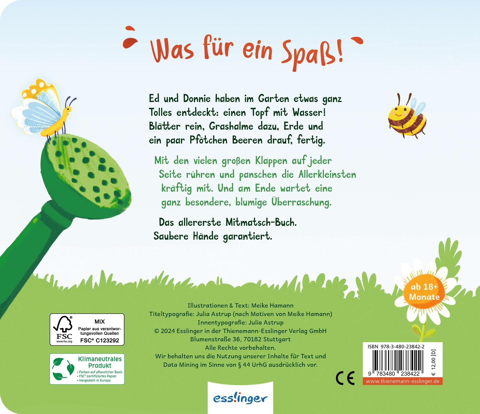Die Gartenhörnchen Ed und Donnie machen es vor: Einfach ein paar Grashalme, etwas Erde und ein paar Pfötchen Beeren in einen Topf mit Wasser geben und kräftig umrühren. Die Allerkleinsten helfen auf jeder Seite mit. Mit den großen Klappen pflücken und panschen sie, was das Zeug hält. Was für ein Vergnügen! Und am Ende wird aus lustiger Matschepampe im Handumdrehen der beste Dünger für die Blumenwiese.