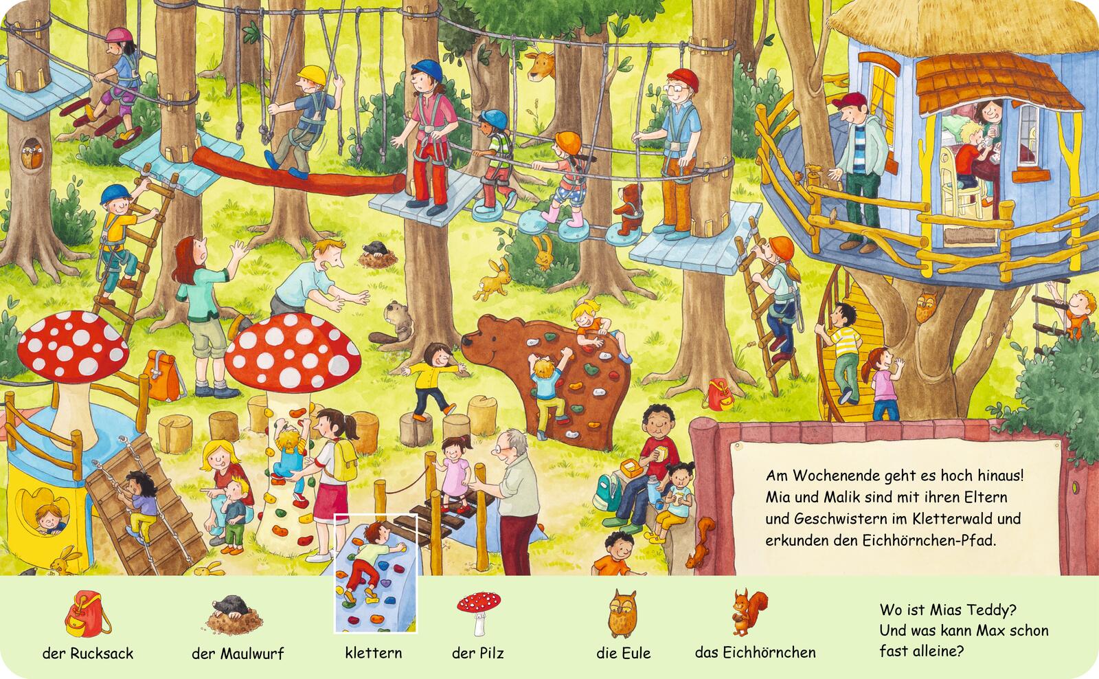 - Das Bildwörter-Wimmelbuch ist praktisch gegliedert nach verschiedenen Themenbereichen aus dem Kinderalltag wie Stadt, Einkaufen, Spielplatz, Kindergarten, Streichelzoo, Abenteuer- und Kletterpark.