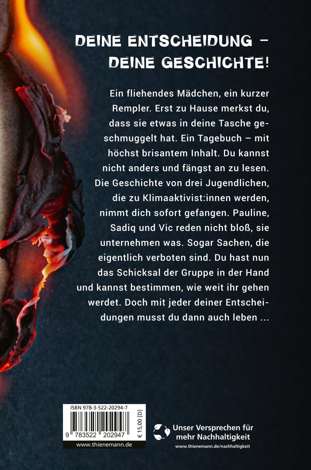 Ein Mädchen flüchtet aus der Bahn und rempelt dich an. Erst zu Hause merkst Du, dass sie etwas in deine Tasche geschmuggelt hat. Ein Tagebuch - mit höchst brisantem Inhalt. Du kannst nicht anders, du fängst an zu lesen. Die Geschichte von drei Jugendlichen, die zu Klimaaktivist:innen werden, nimmt dich sofort gefangen. Auch du findest ja, dass sich endlich was ändern muss, um das Klima zu retten. Pauline, Sadiq und Vic reden nicht bloß, sie unternehmen was. Auch Sachen, die eigentlich verboten sind. Du hast nun das Tagebuch und damit das Schicksal der Gruppe in der Hand und kannst bestimmen, wie weit ihr gehen werdet. Doch mit jeder deiner Entscheidungen musst du dann auch leben ...