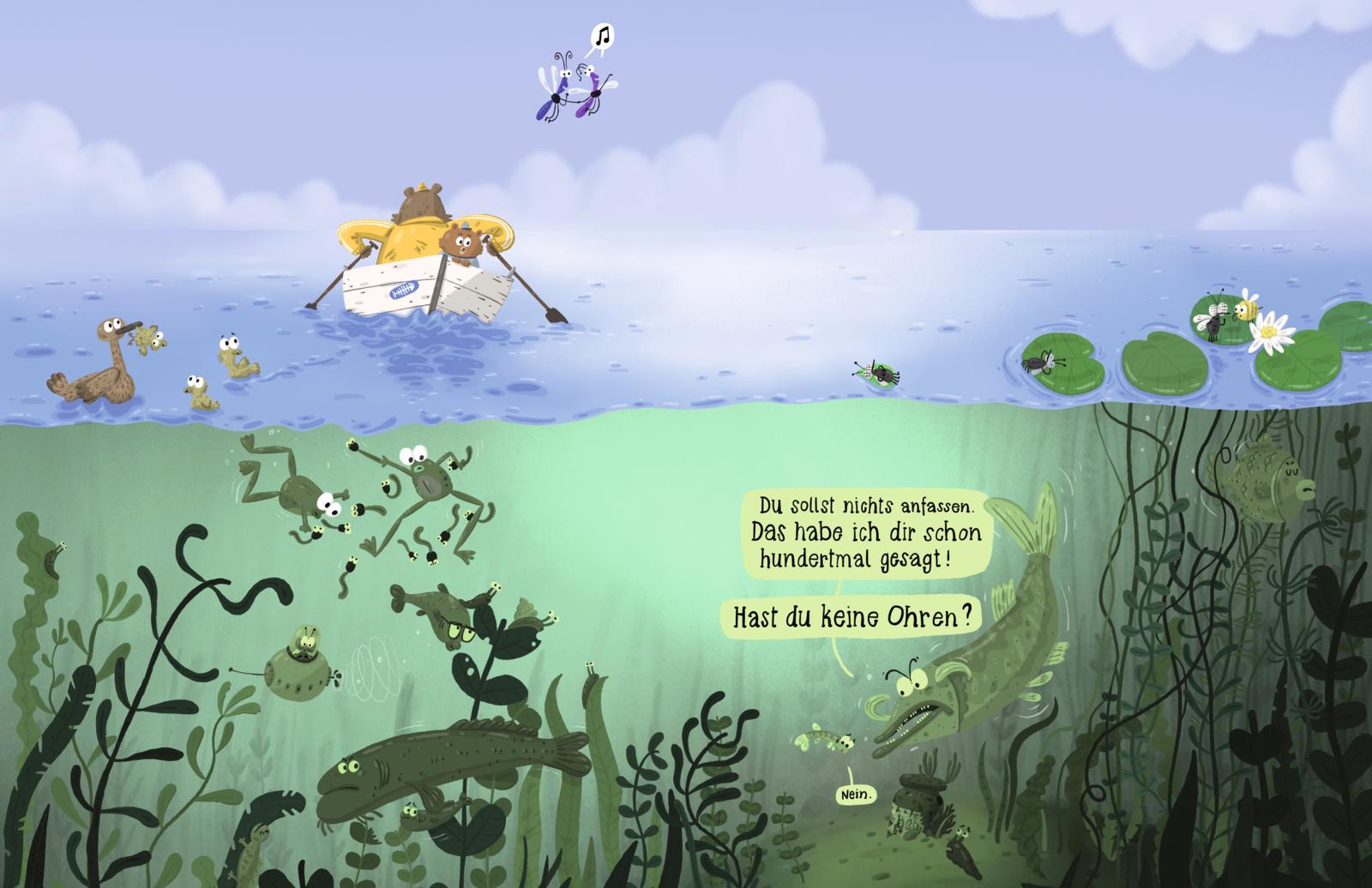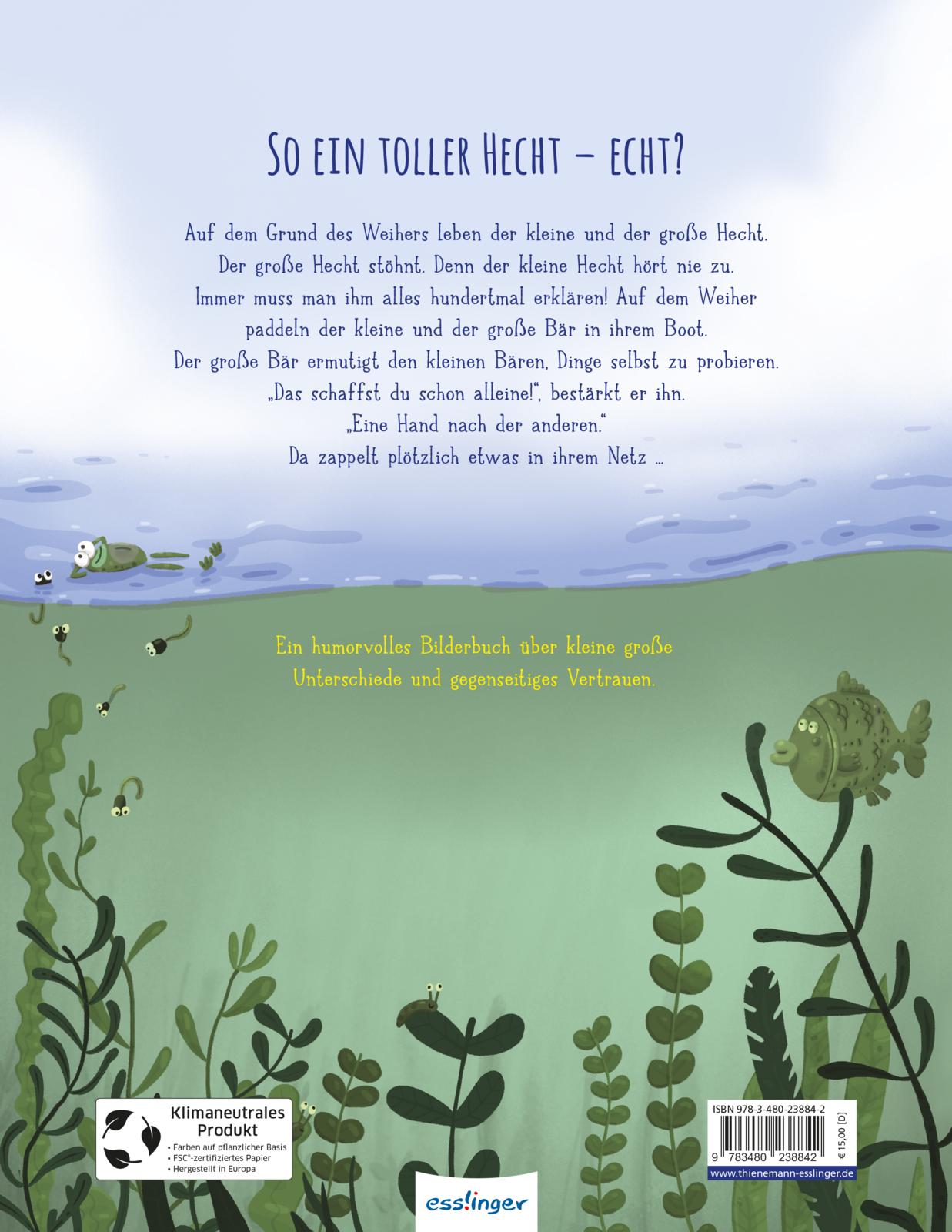 Der große Hecht stöhnt. Die kleinen Fische hören nie zu. Immer muss man ihnen alles hundertmal erklären. Auf dem Weiher paddeln der kleine und der große Bär in ihrem Boot. Auch der große Bär muss dem kleinen Bären noch viel beibringen. Aber er ermutigt ihn, Dinge selbst zu probieren. "Das schaffst du schon alleine!", unterstützt er seinen Sohn. "Eine Pfote nach der anderen!" Und siehe da: Da zappelt plötzlich etwas in ihrem Netz ...