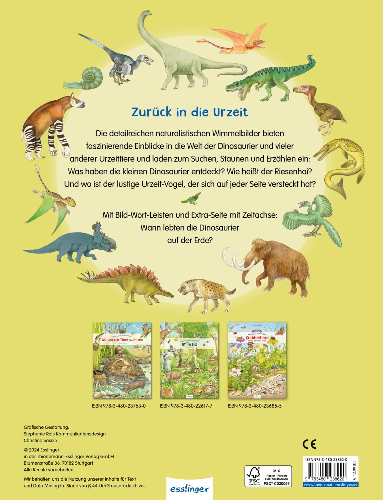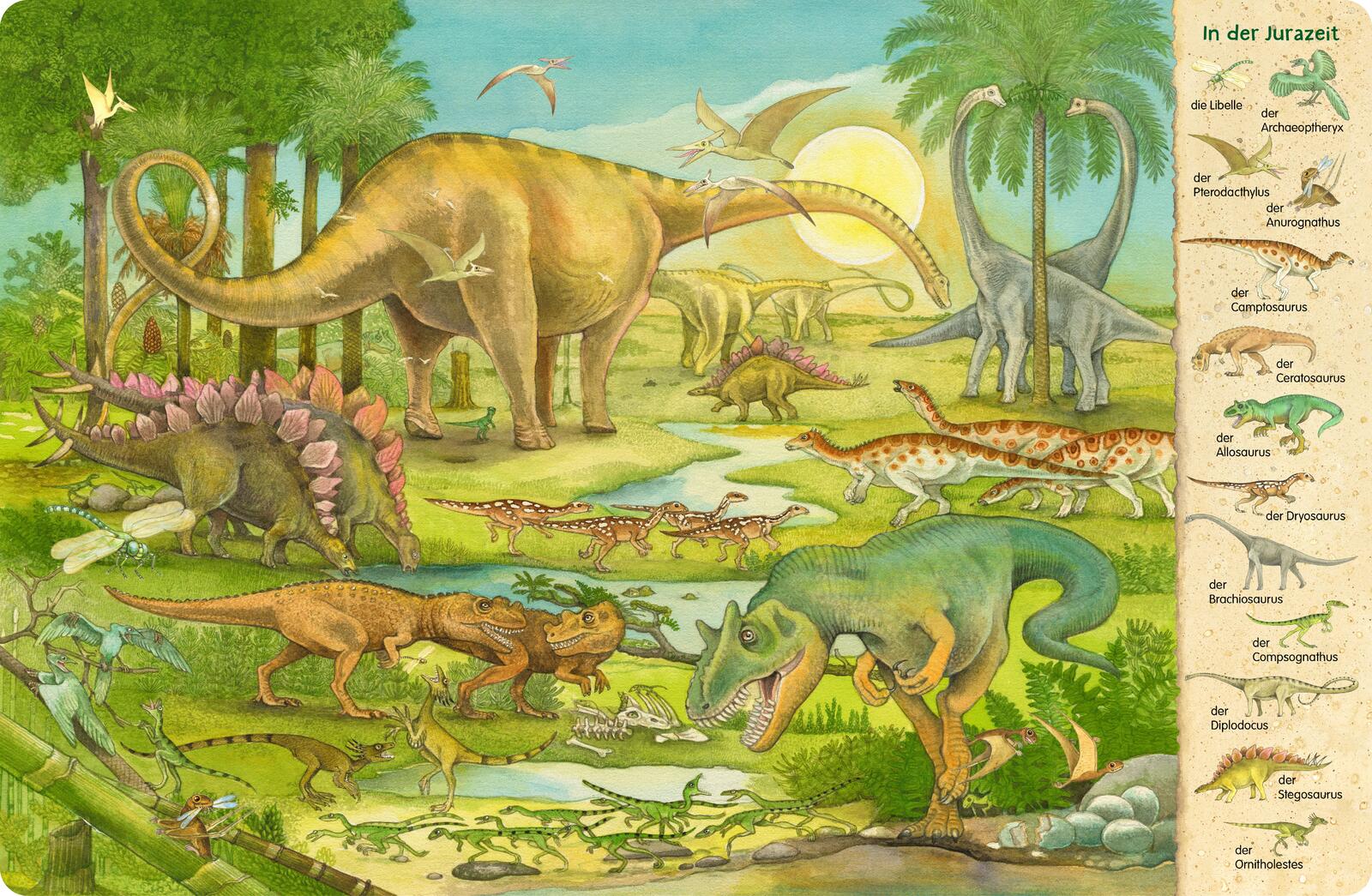 Die detailreichen naturalistischen Wimmelbilder bieten faszinierende Einblicke in die Welt der Dinosaurier und vieler anderer Urzeittiere und laden zum Suchen, Staunen und Erzählen ein. In dem Wimmelbuch lassen sich über 100 Dinosaurier entdecken, von Ankylosaurus bis Zephyrosaurus: Beginnend mit dem Auftauchen der Dinosaurier im Zeitalter der Trias bis zum Aussterben der Dinos am Ende der Kreidezeit.