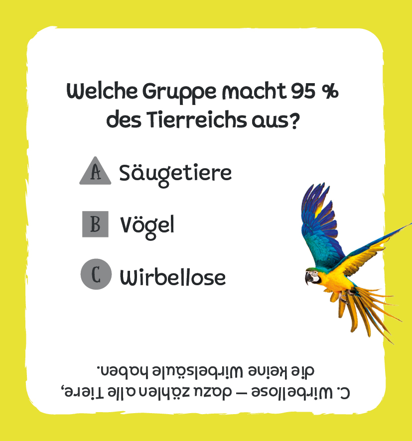 Teste dein Wissen mit 250 spannenden Fragen und entdecke verblüffende Fakten über die Tiere dieser Welt: Wie heißt das einzige fliegende Säugetier? Welche Tiere gibt es am häufigsten auf der Welt? Und warum bewegen sich Ameisen immer in einer Reihe?