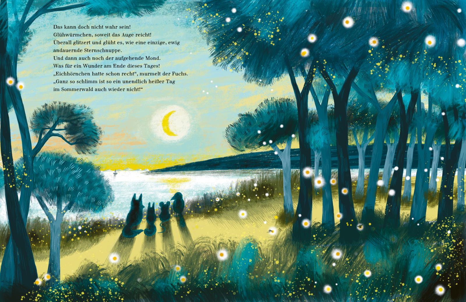 Ist das heiß! Maus, Fuchs und Rabe ächzen in der Sommerhitze. Das Eichhörnchen weiß, was man da am besten macht: Nix wie in den kühlen See! Die anderen zögern und wollen sich das Fell nicht nass machen, aber da ist das Eichhörnchen schon längst mit einem Platsch vom Ufer gesprungen. Während die Freunde ihr übermütiges Eichhörnchen wieder aus dem See angeln, finden sie ebenfalls Gefallen am kühlen Nass und es dauert nicht lange, bis alle zusammen vergnügt im Wasser plantschen. Der Sommertag endet mit einer wunderbaren Überraschung für alle.