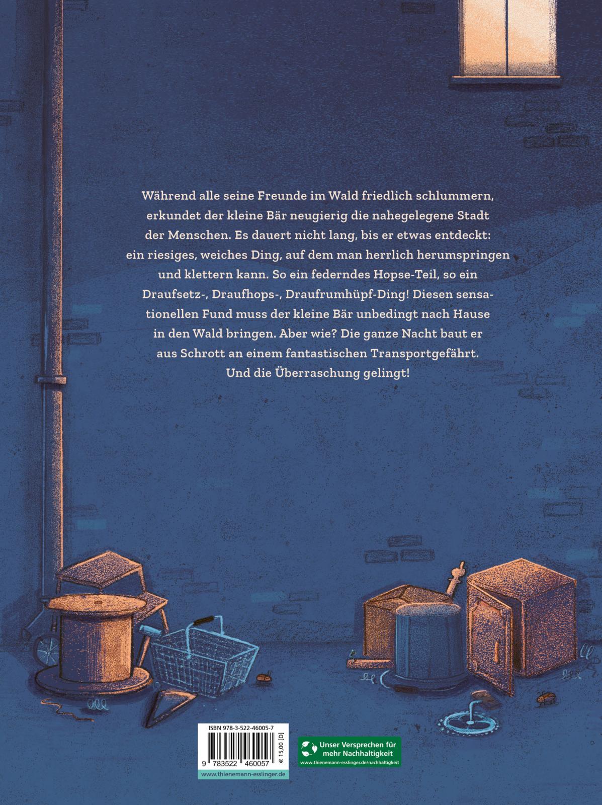Während alle Tiere im Wald friedlich schlummern, ist der kleine Bär noch kein bisschen müde. Neugierig erkundet er die nahegelegene Stadt und entdeckt etwas Faszinierendes: ein riesiges, weiches Ding, auf dem man herrlich herumspringen und klettern kann. Diesen sensationellen Fund - in Wirklichkeit ein altes Sofa - muss der kleine Bär unbedingt seinen Freunden im Wald zeigen. Aber wie? Die ganze Nacht baut er aus Schrott an einem fantastischen Transportgefährt.