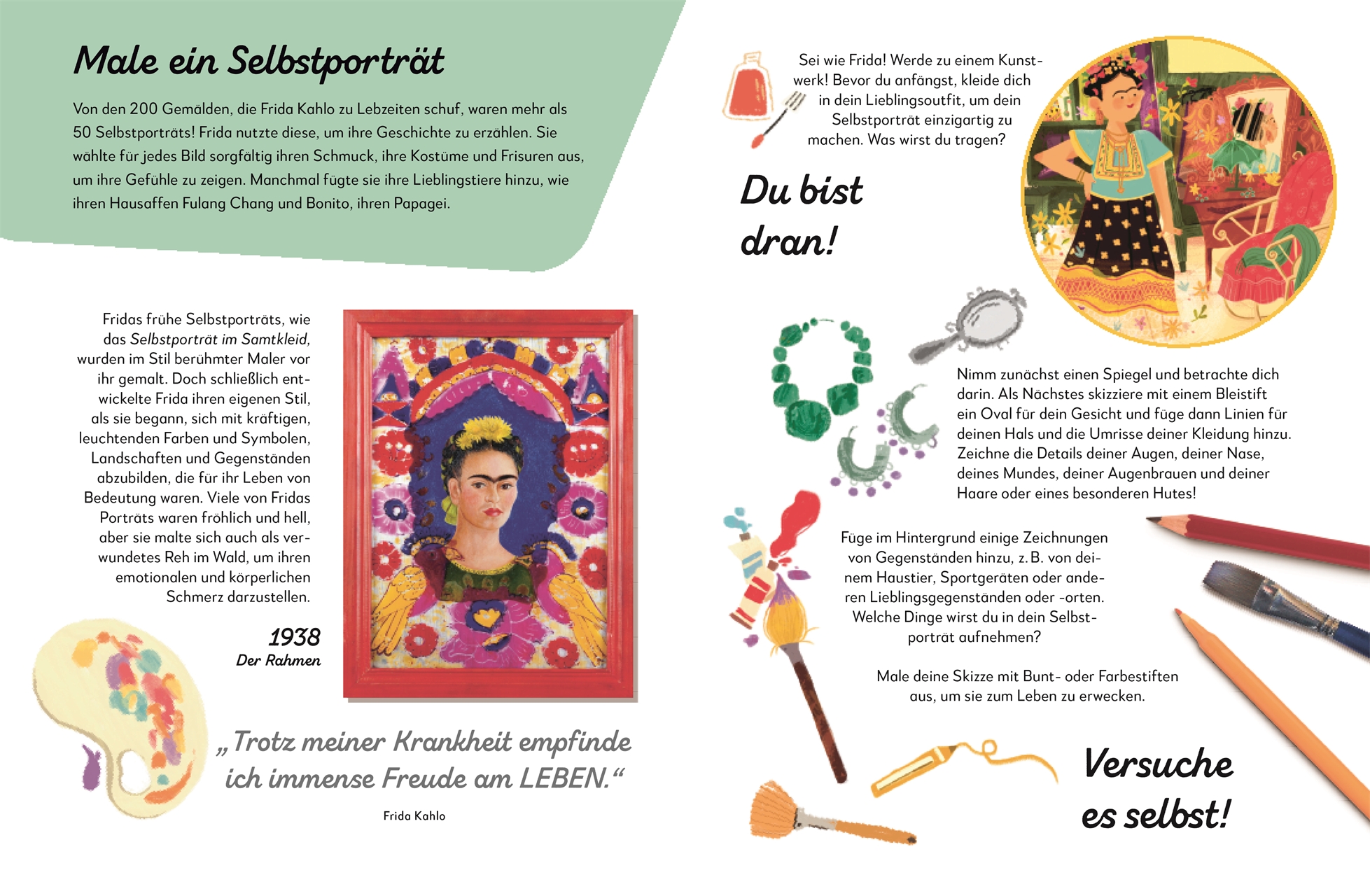 - Selbst kreativ sein: Enthält Anregungen, wie man den Stil von Frida Kahlo kopiert und Tipps zur Gestaltung eines Selbstporträts.