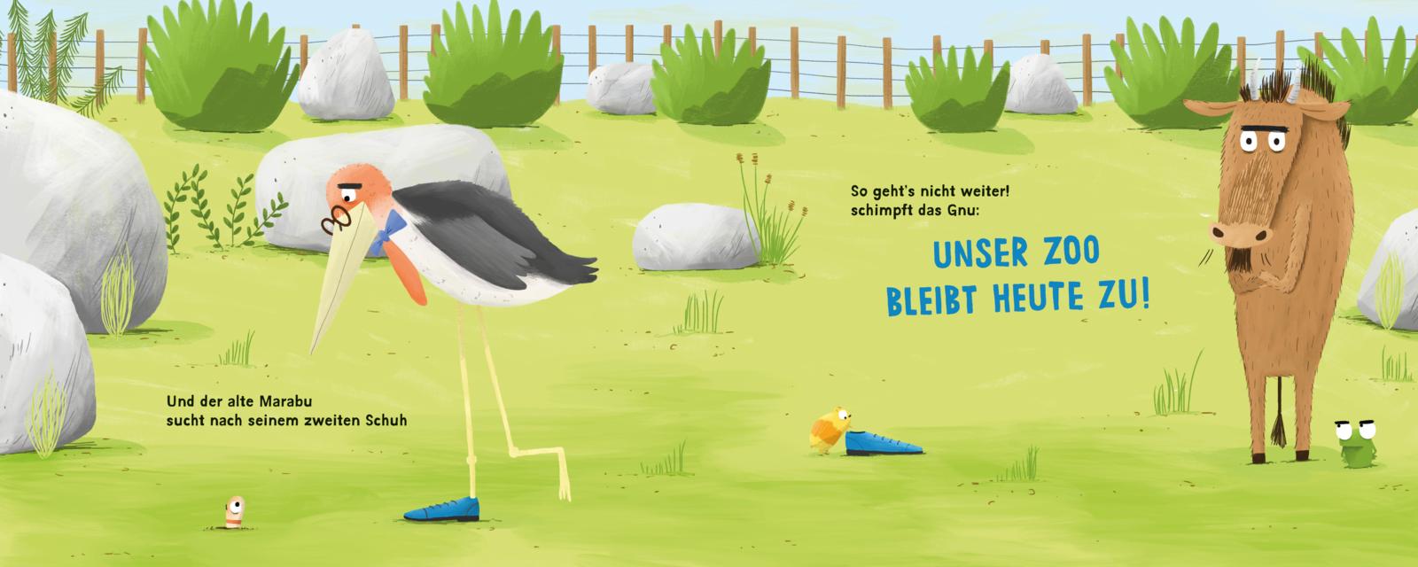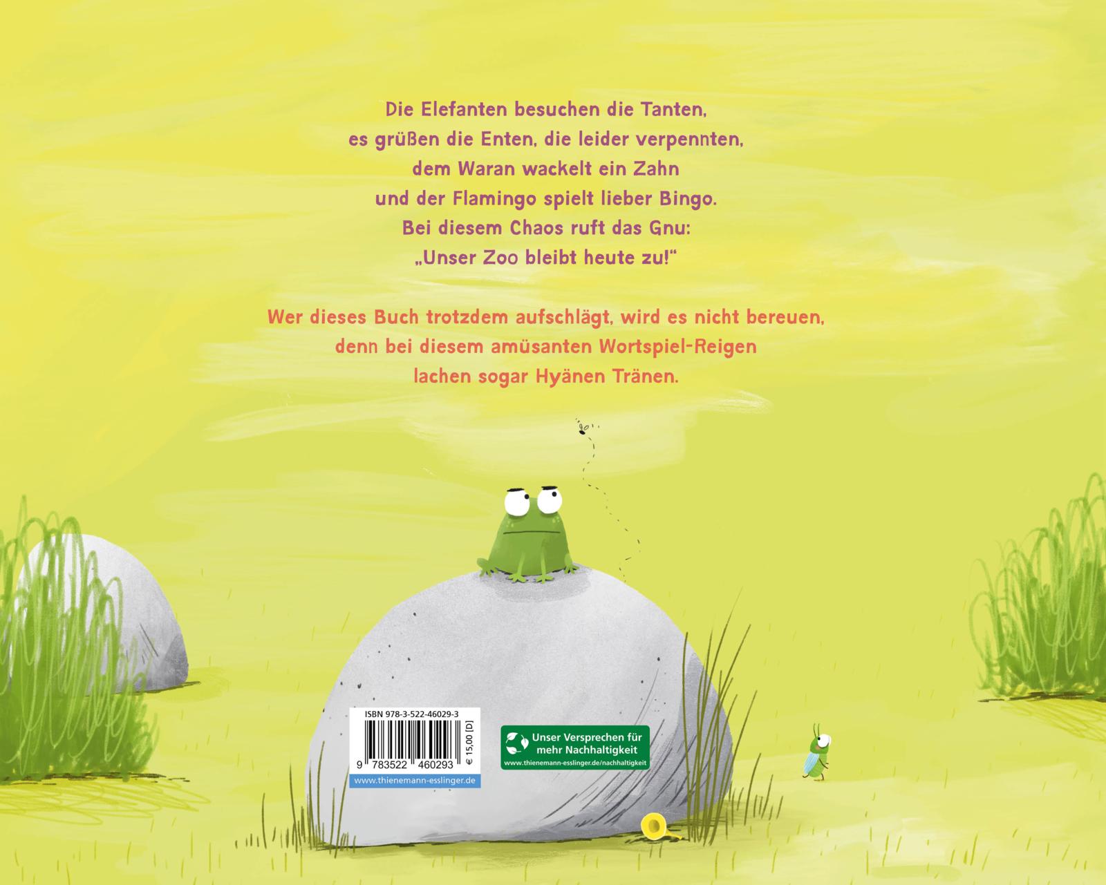 Was ist denn das hier für ein tierisches Durcheinander? Dem Waran wackelt ein Zahn, der Flamingo ist beim Bingo, der Reiher zankt mit dem Geier und die Möwen ärgern den Löwen. Bei diesem Chaos ruft das Gnu: 'Unser Zoo bleibt heute zu!" Wer dieses Bilderbuch trotzdem aufschlägt, wird es nicht bereuen, denn die genialen Reime und witzigen Illustrationen sind ein riesen Lesespaß für Groß und Klein. Nach 'Das Aquarium bleibt heute geschlossen!' kommt hier das neue Reim-Feuerwerk von Michael Augustin und Andrea Ringli.