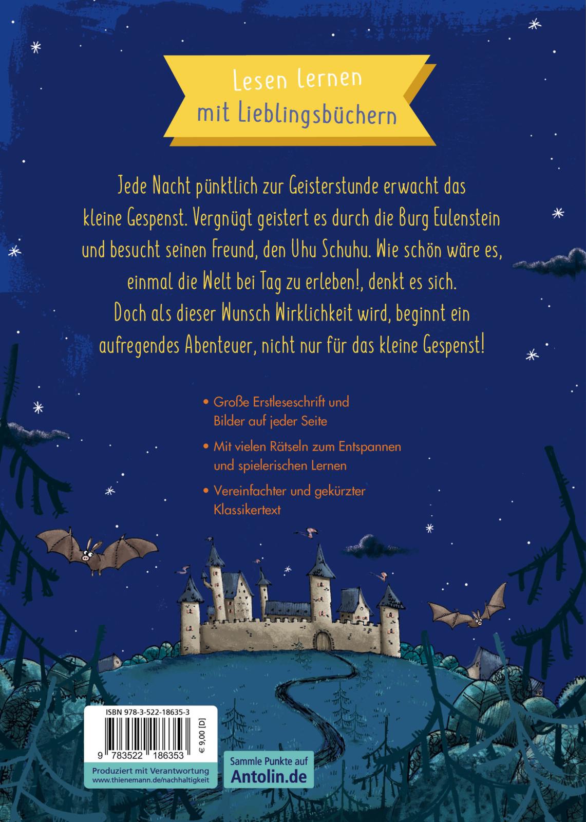 Jede Nacht pünktlich zur Geisterstunde erwacht das kleine Gespenst. Vergnügt geistert es durch die Burg Eulenstein und besucht seinen Freund, den Uhu Schuhu. Wie schön wäre es, einmal die Welt bei Tag zu erleben!, denkt es sich. Doch als dieser Wunsch Wirklichkeit wird, beginnt ein aufregendes Abenteuer, nicht nur für das kleine Gespenst!