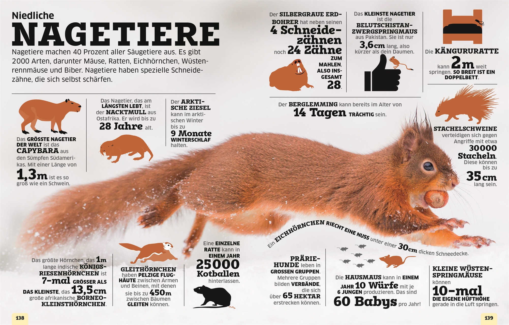 - Wissen visuell: Infografiken, Daten und Statistiken reihen sich um beeindruckende Tierfotografien, ob fliegende Kolibris oder durch die Savanne streifende Elefanten.