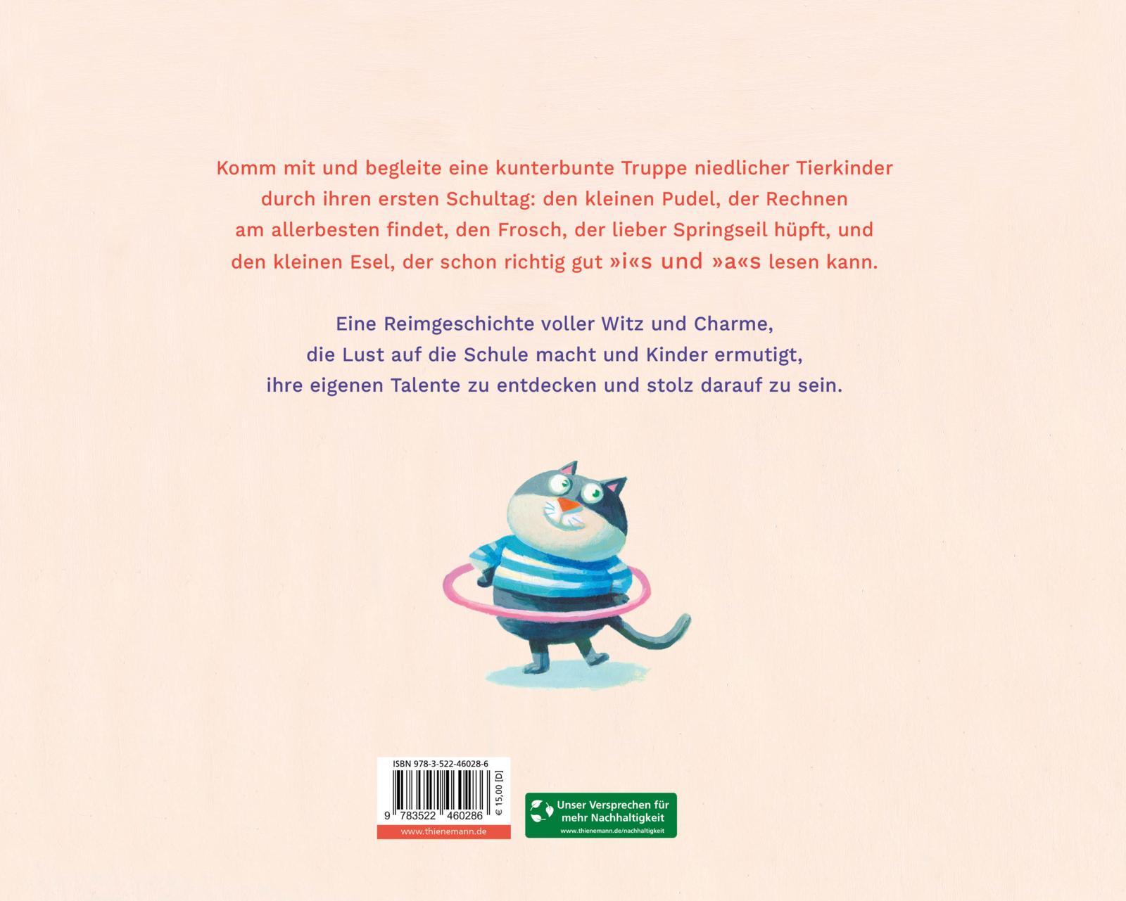 Eine bunte Truppe niedlicher Tierkinder und ihr spannender erster Schultag: Den kleinen Pudel, der Rechnen am allerbesten findet, den Frosch, der lieber Springseil hüpft und den kleinen Esel, der schon richtig gut "i"s und "a"s lesen kann. In dieser humorvoll gereimten und liebevoll illustrierten Geschichte erfahren Kinder ab 4 Jahren, wie aurfregend es sein kann, sein ganz eigenes Talent zu entdecken. Denn auch bei Tierkindern gilt: Jedes Kind ist einzigartig!