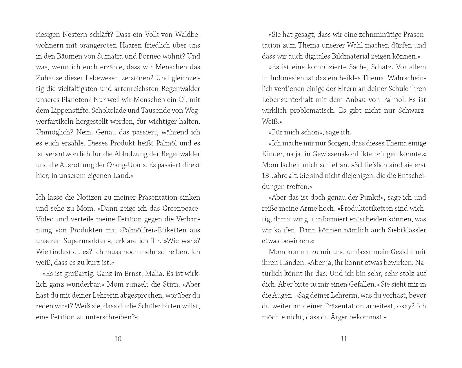 Malia ist verzweifelt: Nach dem Tod ihres Vaters soll sie ihr geliebtes Heimatland Indonesien verlassen und mit der Mutter nach Kanada auswandern. Doch was wird dann aus ihrem Kampf für den Schutz der Orang-Utans und für den Erhalt der kostbaren Regenwälder? Malia spürt, dass sie nach Indonesien gehört und will alles daransetzen, um dort zu bleiben. Da begegnet sie Ari, dem Jungen vom Land, der seine ganz eigenen Kämpfe führt: Endlich geht er zur Schule, doch könnte er dieses Privileg verlieren, wenn er Ginger Juice, ein Orang-Utan-Mädchen, retten will. Ginger Juice wird von Aris Onkel in einem viel zu engen Käfig gehalten, und Ari weiß, dass sie leidet. Doch den Regenwald, wo Ginger Juice geboren wurde, gibt es nicht mehr - dort befindet sich jetzt eine Palmöl-Plantage. Werden Malia und Ari die richtigen Entscheidungen treffen und ihre Herzensziele erreichen?Ein inspirierender Roman zum Thema Umweltaktivismus - abwechselnd aus den Perspektiven von Malia, Ari und Ginger Juice erzählt.