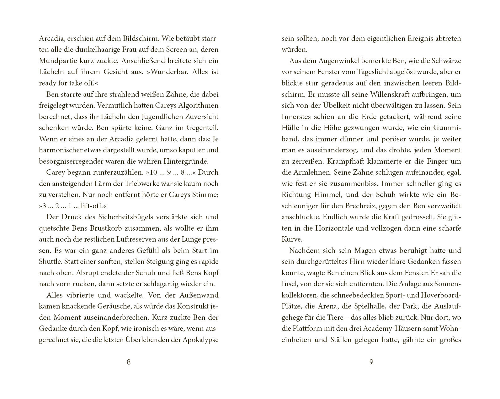Emily und Ben wissen nun, welches Ziel auf der Elite-Akademie Arcadia tatsächlich verfolgt wird. Ohne ihr Wissen sind die Schüler darauf vorbereitet worden, nach dem bevorstehenden Klimakollaps die Entstehung einer neuen Zivilisation auf der Erde mitzugestalten. Doch bevor es so weit ist, sollen sie zuerst an einen geheimen und sicheren Ort gebracht werden, um ihr Überleben zu gewährleisten. Der Preis dafür ist allerdings hoch, denn sie werden ihre Familien nie wiedersehen. Nicht alle der jungen Tech-Genies sind bereit, ihn zu zahlen, und es formiert sich Widerstand. Emily und Ben müssen entscheiden, was ihnen wichtiger ist, ihre eigene Zukunft oder das Überleben der Menschen, die sie lieben ...