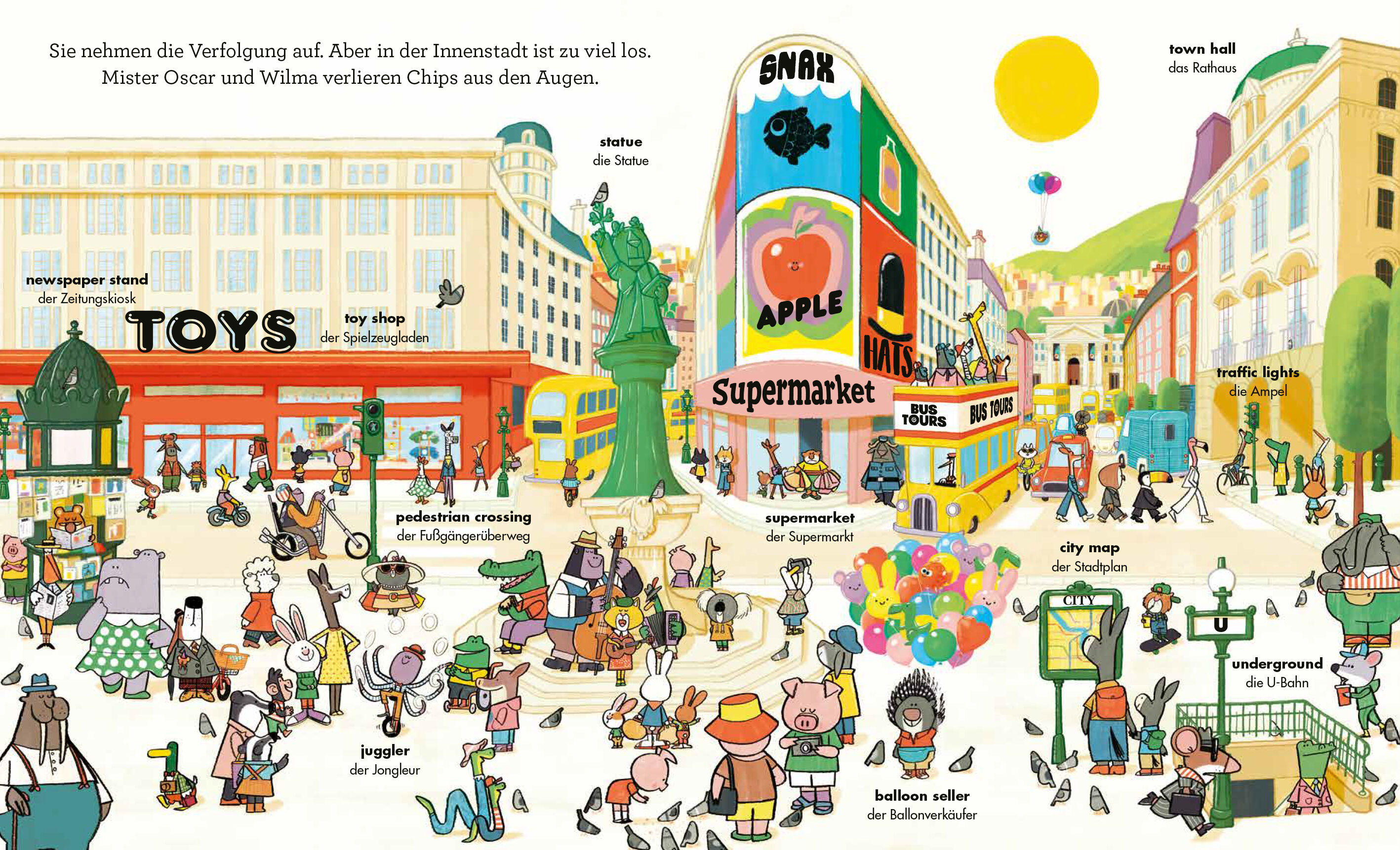 Goldfisch Chips hat Geburtstag - das will Mister Oscar natürlich groß feiern. Doch für das Geburtstagspicknick fehlt noch einiges. Und dann geht Chips beim Einkaufen in der Stadt verloren! Mister Oscar sucht überall nach dem Goldfisch, im Museum, im Park und im Stadtzentrum. An jeder Station helfen mehr neue Freunde mit. Am Ende ist Chips wieder in Sicherheit. Und dann wird gefeiert!In den fröhlichen Wimmelbildern gibt es viel zu entdecken - und ganz nebenbei lernen schon die Kleinsten erste englische Wörter und Redewendungen kennen. Ein riesiger Spaß zum Immer-wieder-Anschauen!