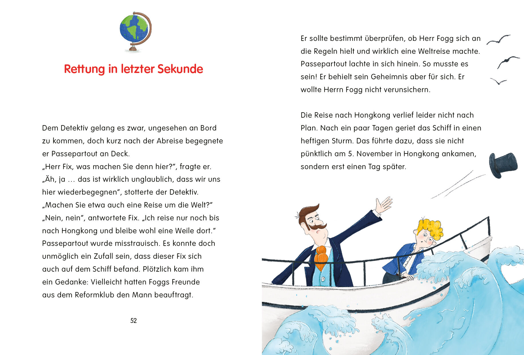 Schafft man es in nur 80 Tagen einmal um die Erde? Mister Fogg ist sich da sicher. Er geht eine Wette ein, die ihn und seinen Diener Passepartout auf eine spannende Reise durch die ganze Welt führt. Dabei geraten die beiden von einem Abenteuer ins andere und werden vom mysteriösen Detektiv Fix verfolgt. Ob Mister Fogg und sein Diener den Wettlauf gegen die Zeit gewinnen können? Der Klassiker der Weltliteratur liebevoll nacherzählt für Kinder ab 7 Jahren.